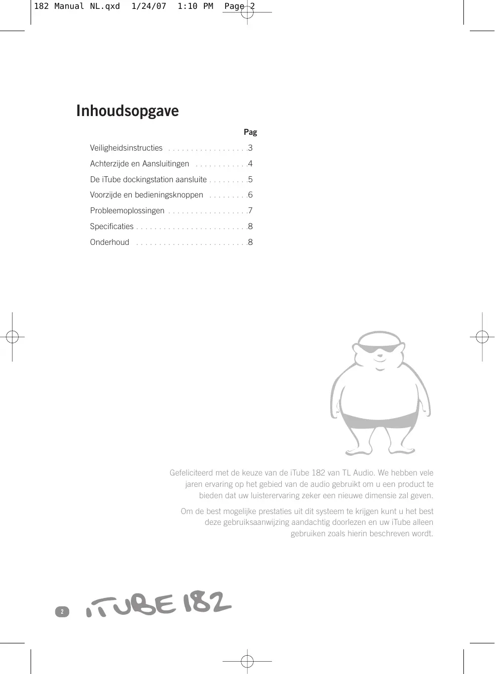 - Onderhoud Gefeliciteerd met de keuze van de iTube 182 van TL Audio. We hebben vele jaren ervaring op het gebied van de audio gebruikt om u een product te bieden dat uw luisterervaring zeker een nieuwe dimensie zal geven. Om de best mogelijke prestaties uit dit systeem te krijgen kunt u het best deze gebruiksaanwijzing aandachtig doorlezen en uw iTube alleen gebruiken zoals hierin beschreven wordt. p. 8