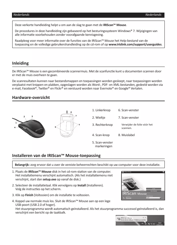IRIScan™ Mouse est une souris-scanneur tout-en-un. Grâce à la fonction de numérisation, vous pouvez scanner des documents en faisant glisser la souris sur ceux-ci. Il est possible de faire glisser et déposer les résultats de la numérisation dans des dossiers de fichiers et des applications, de les copier-coller dans des applications, de les enregistrer au format Word, PDF et XML files, de les partager via e-mail, Facebook®, Twitter®, Flickr® et de les envoyer vers Evernote® et Google® Translate.