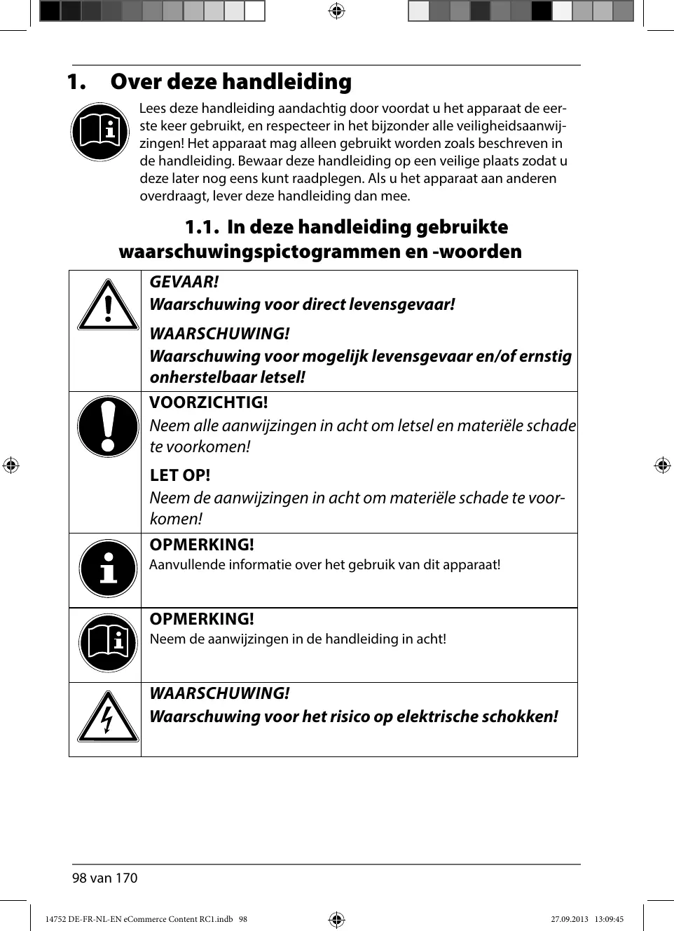 4.1. Catégories de personnes restreintes 4.2. Catégories de personnes non autorisées • Conservez l'appareil et les accessoires dans un endroit hors de la portée des enfants. • Le présent appareil peut être utilisé par des enfants à partir de 8 ans et par des personnes à capacités physiques, sensorielles ou mentales restreintes ou manquant d'expériences et/ou de connaissances s'ils sont surveillés ou s'ils ont reçu des instructions pour pouvoir utiliser l'appareil en toute sécurité et ont compris les dangers en résultant. Ne pas laisser les enfants jouer avec l'appareil. Le nettoyage et la maintenance de l'appareil par l'utilisateur ne 30 / 170 14752 DE-FR-NL-EN eCommerce Content RC1.indb 30
