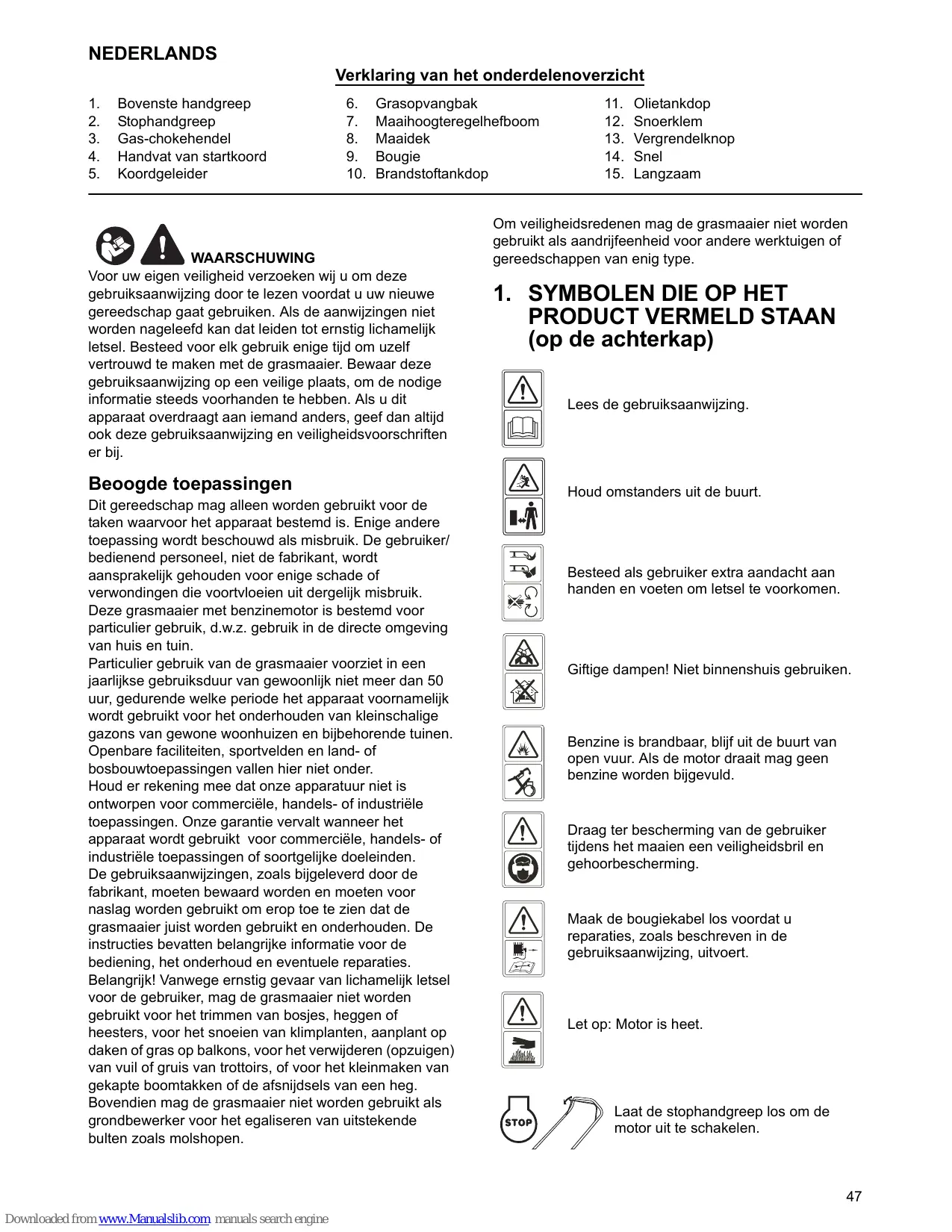 Beoogde toepassingen Dit gereedschap mag alleen worden gebruikt voor de taken waarvoor het apparaat bestemd is. Enige andere toepassing wordt beschouwd als misbruik. De gebruiker/ bedienend personeel, niet de fabrikant, wordt aansprakelijk gehouden voor enige schade of verwondingen die voortvloeien uit dergelijk misbruik. Deze grasmaaier met benzinemotor is bestemd voor particulier gebruik, d.w.z. gebruik in de directe omgeving van huis en tuin. Particulier gebruik van de grasmaaier voorziet in een jaarlijkse gebruiksduur van gewoonlijk niet meer dan 50 uur, gedurende welke periode het apparaat voornamelijk wordt gebruikt voor het onderhouden van kleinschalige gazons van gewone woonhuizen en bijbehorende tuinen. Openbare faciliteiten, sportvelden en land- of bosbouwtoepassingen vallen hier niet onder. Houd er rekening mee dat onze apparatuur niet is ontworpen voor commerciële, handels- of industriële toepassingen. Onze garantie vervalt wanneer het apparaat wordt gebruikt voor commerciële, handels- of industriële toepassingen of soortgelijke doeleinden. De gebruiksaanwijzingen, zoals bijgeleverd door de fabrikant, moeten bewaard worden en moeten voor naslag worden gebruikt om erop toe te zien dat de grasmaaier juist worden gebruikt en onderhouden. De instructies bevatten belangrijke informatie voor de bediening, het onderhoud en eventuele reparaties. Belangrijk! Vanwege ernstig gevaar van lichamelijk letsel voor de gebruiker, mag de grasmaaier niet worden gebruikt voor het trimmen van bosjes, heggen of heesters, voor het snoeien van klimplanten, aanplant op daken of gras op balkons, voor het verwijderen (opzuigen) van vuil of gruis van trottoirs, of voor het kleinmaken van gekapte boomtakken of de afsnijdsels van een heg. Bovendien mag de grasmaaier niet worden gebruikt als grondbewerker voor het egaliseren van uitstekende bulten zoals molshopen.