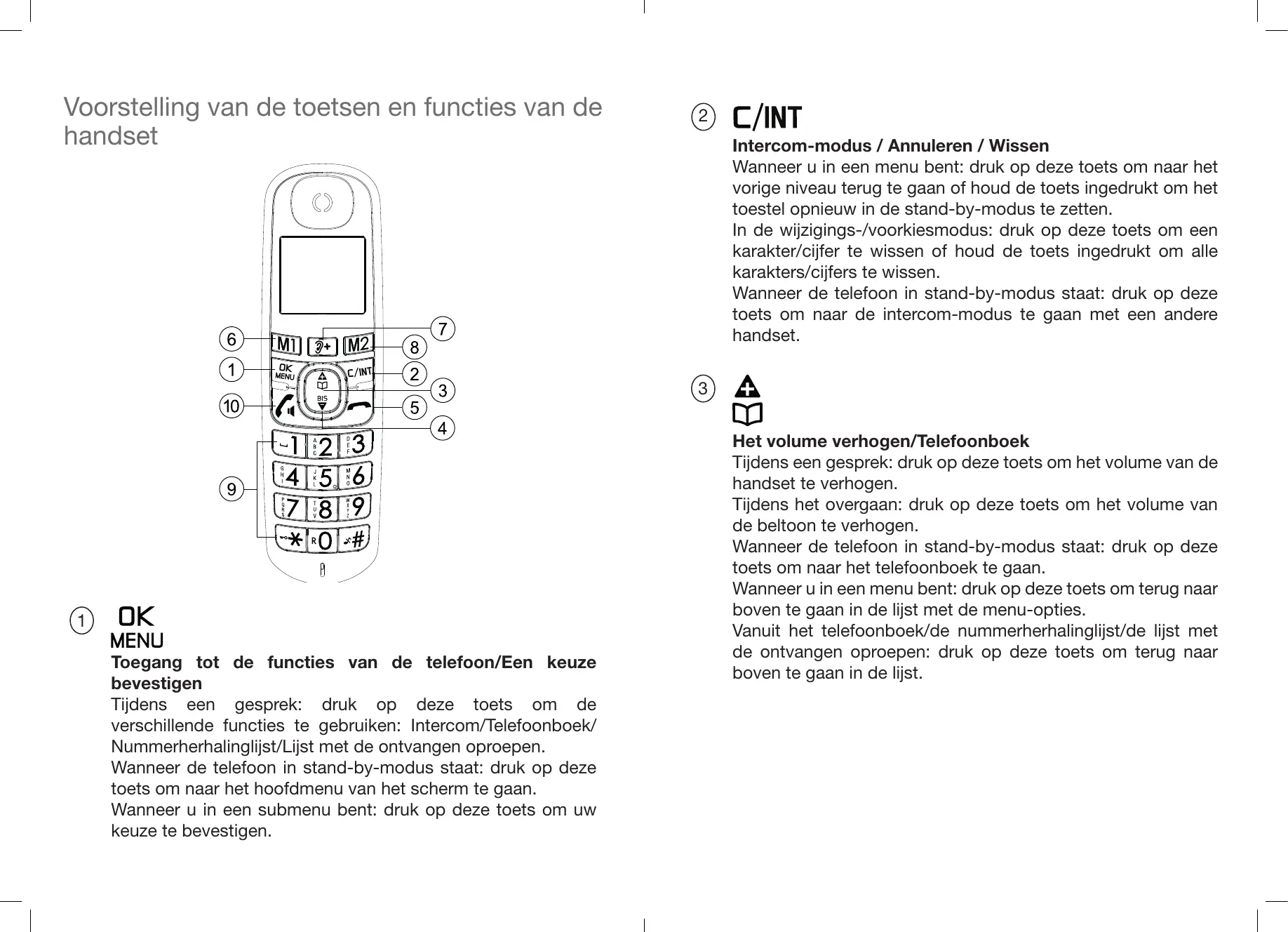Intercom-modus / Annuleren / Wissen Wanneer u in een menu bent: druk op deze toets om naar het vorige niveau terug te gaan of houd de toets ingedrukt om het toestel opnieuw in de stand-by-modus te zetten. In de wijzigings-/voorkiesmodus: druk op deze toets om een karakter/cijfer te wissen of houd de toets ingedrukt om alle karakters/cijfers te wissen. Wanneer de telefoon in stand-by-modus staat: druk op deze toets om naar de intercom-modus te gaan met een andere handset.
