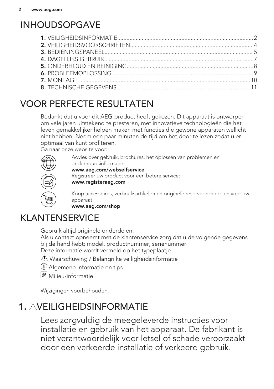 Bedankt dat u voor dit AEG-product heeft gekozen. Dit apparaat is ontworpen om vele jaren uitstekend te presteren, met innovatieve technologieën die het leven gemakkelijker helpen maken met functies die gewone apparaten wellicht niet hebben. Neem een paar minuten de tijd om het door te lezen zodat u er optimaal van kunt profiteren. Ga naar onze website voor: Advies over gebruik, brochures, het oplossen van problemen en onderhoudsinformatie: www.aeg.com/webselfservice Registreer uw product voor een betere service: www.registeraeg.com Koop accessoires, verbruiksartikelen en originele reserveonderdelen voor uw apparaat: www.aeg.com/shop KLANTENSERVICE Gebruik altijd originele onderdelen. Als u contact opneemt met de klantenservice zorg dat u de volgende gegevens bij de hand hebt: model, productnummer, serienummer. Deze informatie wordt vermeld op het typeplaatje. Waarschuwing / Belangrijke veiligheidsinformatie Algemene informatie en tips Milieu-informatie Wijzigingen voorbehouden.