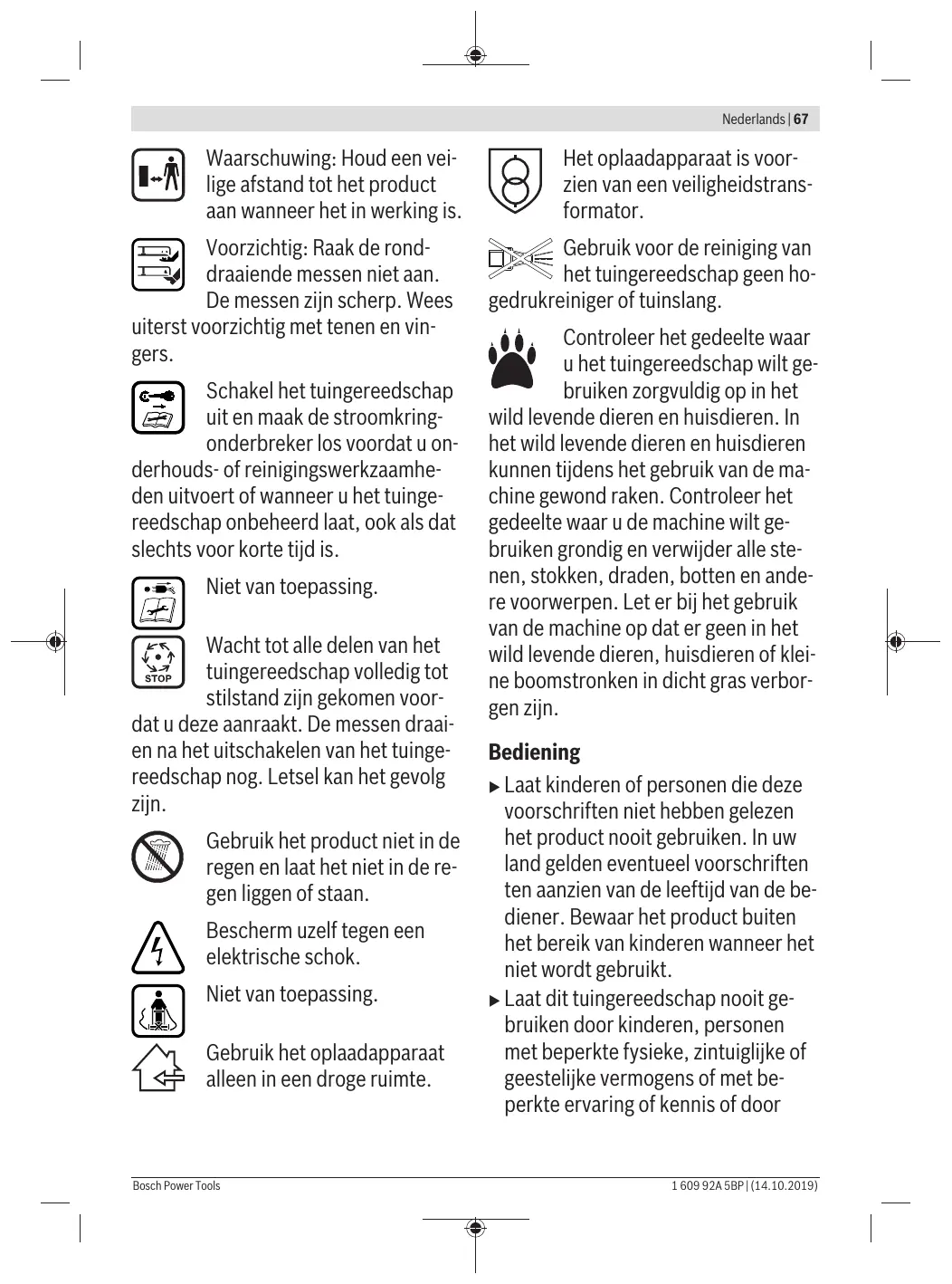 Inserire correttamente la batteria nella stazione di ricarica la batteria ricaricabile ed il sacco raccoglierba prima di effettuare interventi di manutenzione o di pulizia. u Mettere sempre guanti da giardino maneggiando o lavorando nel settore delle lame taglienti. Osservare le seguenti indicazioni e provvedimenti per garantire un utilizzo ottimale della batteria ricaricabile: 1 609 92A 5BP | (14.10.2019) 66 | Nederlands – Proteggere la batteria ricaricabile da umidità ed acqua. – Immagazzinare l’apparecchio per il giardinaggio e la batteria ricaricabile esclusivamente nel campo di temperatura tra -20 °C e 50 °C. Ad es. in estate non lasciare in auto la batteria ricaricabile. – Immagazzinare la batteria ricaricabile separatamente e non nella stazione di ricarica. – In caso di irradiamento solare diretto non lasciare la batteria ricaricabile nell’apparecchio per il giardinaggio. – La temperatura ottimale per la conservazione della batteria ricaricabile è di 5 °C. – Pulire di tanto in tanto le fessure di ventilazione della batteria ricaricabile con un pennello morbido, pulito ed asciutto. Un tempo di funzionamento notevolmente ridotto dopo la ricarica indica che la batteria ricaricabile è consumata e deve essere sostituita. Servizio di assistenza e consulenza tecnica www.bosch-garden.com In caso di richieste o di ordinazione di pezzi di ricambio, comunicare sempre il codice prodotto a 10 cifre riportato sulla targhetta di identificazione del prodotto. Svizzera Sul sito www.bosch-pt.com/ch/it è possible ordinare direttamente on-line i ricambi. Tel.: (044) 8471513 Fax: (044) 8471553 E-Mail: Aftersales.Service@de.bosch.com Italia Tel.: (02) 3696 2314 E-Mail: pt.hotlinebosch@it.bosch.com Trasporto Le batterie ricaricabili agli ioni di litio contenute sono soggette ai requisiti di legge relativi a merci pericolose. Le batterie ricaricabili possono essere trasportate su strada tramite l’utente senza ulteriori precauzioni. In caso di spedizione tramite terzi (p. es.: trasporto aereo oppure spedizioniere) devono essere osservati particolari requisiti relativi ad imballo e marcatura. In questo caso per la preparazione del pezzo da spedire è necessario ricorrere ad un esperto per merce pericolosa. Spedire batterie ricaricabili solamente se la carcassa non è danneggiata. Coprire con nastro adesivo i contatti scoperti ed imballare la batteria ricaricabile in modo tale che non si muova nell’imballo. Attenersi anche alle eventuali prescrizioni integrative nazionali. Smaltimento ricaricabili, accessori ed imballaggi non più impiegabili. Non gettare apparecchi per il giardinaggio e batterie ricaricabili/batterie tra i rifiuti domestici! Solo per i Paesi della CE: Conformemente alla direttiva europea 2012/19/UE le apparecchiature elettriche ed elettroniche diventate inservibili e, in base alla direttiva europea 2006/66/CE, le batterie ricaricabili/batterie difettose o consumate devono essere raccolte separatamente ed essere inviate ad una riutilizzazione ecologica. Batterie ricaricabili/Batterie: Ioni di litio: Osservare le istruzioni riportate nel paragrafo Trasporto. Nederlands Veiligheidsvoorschriften Let op! Lees de volgende voorschriften zorgvuldig door. Maak uzelf vertrouwd met de bedieningselementen en het juiste gebruik van het product. Bewaar de gebruiksaanwijzing om deze later te kunnen raadplegen. Verklaring van de symbolen op tuingereedschap, oplaadapparaat en accu Algemene waarschuwing. Lees de gebruiksaanwijzing. Let op dat personen die in de buurt staan niet worden verwond door weggeslingerde voorwerpen. Avviare ad un riciclaggio rispettoso dell’ambiente apparecchi per il giardinaggio, batterie 1 609 92A 5BP | (14.10.2019) Bosch Power Tools Nederlands | 67 Waarschuwing: Houd een veilige afstand tot het product aan wanneer het in werking is. Voorzichtig: Raak de ronddraaiende messen niet aan. De messen zijn scherp. Wees uiterst voorzichtig met tenen en vingers. Schakel het tuingereedschap uit en maak de stroomkringonderbreker los voordat u onderhouds- of reinigingswerkzaamheden uitvoert of wanneer u het tuingereedschap onbeheerd laat, ook als dat slechts voor korte tijd is. Niet van toepassing. Wacht tot alle delen van het tuingereedschap volledig tot stilstand zijn gekomen voordat u deze aanraakt. De messen draaien na het uitschakelen van het tuingereedschap nog. Letsel kan het gevolg zijn. Gebruik het product niet in de regen en laat het niet in de regen liggen of staan. Bescherm uzelf tegen een elektrische schok. Niet van toepassing. Gebruik het oplaadapparaat alleen in een droge ruimte. Bosch Power Tools Het oplaadapparaat is voorzien van een veiligheidstransformator. Gebruik voor de reiniging van het tuingereedschap geen hogedrukreiniger of tuinslang. Controleer het gedeelte waar u het tuingereedschap wilt gebruiken zorgvuldig op in het wild levende dieren en huisdieren. In het wild levende dieren en huisdieren kunnen tijdens het gebruik van de machine gewond raken. Controleer het gedeelte waar u de machine wilt gebruiken grondig en verwijder alle stenen, stokken, draden, botten en andere voorwerpen. Let er bij het gebruik van de machine op dat er geen in het wild levende dieren, huisdieren of kleine boomstronken in dicht gras verborgen zijn. Bediening u Laat kinderen of personen die deze voorschriften niet hebben gelezen het product nooit gebruiken. In uw land gelden eventueel voorschriften ten aanzien van de leeftijd van de bediener. Bewaar het product buiten het bereik van kinderen wanneer het niet wordt gebruikt. u Laat dit tuingereedschap nooit gebruiken door kinderen, personen met beperkte fysieke, zintuiglijke of geestelijke vermogens of met beperkte ervaring of kennis of door 1 609 92A 5BP | (14.10.2019) 68 | Nederlands personen die met deze aanwijzingen niet vertrouwd zijn. u Op kinderen moet toezicht worden gehouden om er zeker van te zijn dat ze niet met het product spelen. u Gebruik het tuingereedschap nooit dicht in de buurt van personen, in 