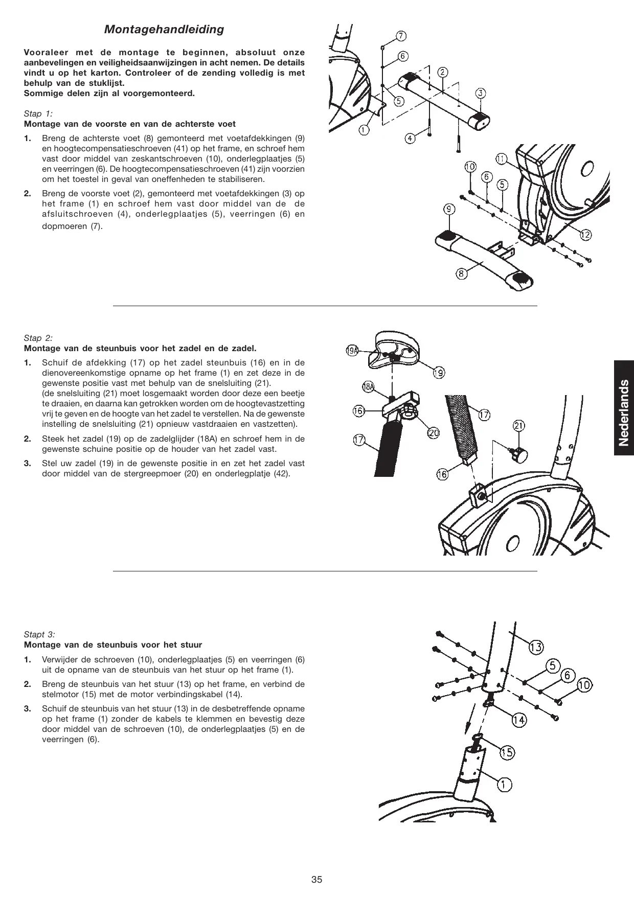 Stel uw zadel (19) in de gewenste positie in en zet het zadel vast door middel van de stergreepmoer (20) en onderlegplatje (42). Nederlands Stap 2: Montage van de steunbuis voor het zadel en de zadel. Stapt 3: Montage van de steunbuis voor het stuur