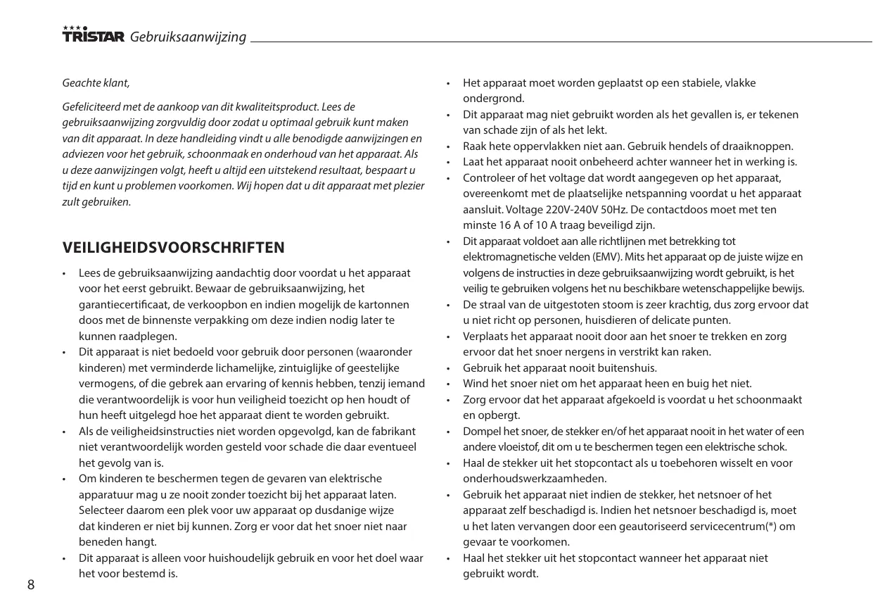 - Voor materièle schade of personlijk letsel veroorzaakt door ondeskundig gebruik of het Niet opvolgen van de veiligheidsvoorschriften is Tristar Niet aansprakelijk. In dergelijk gevallen verralt elke aanspraak op garantie.