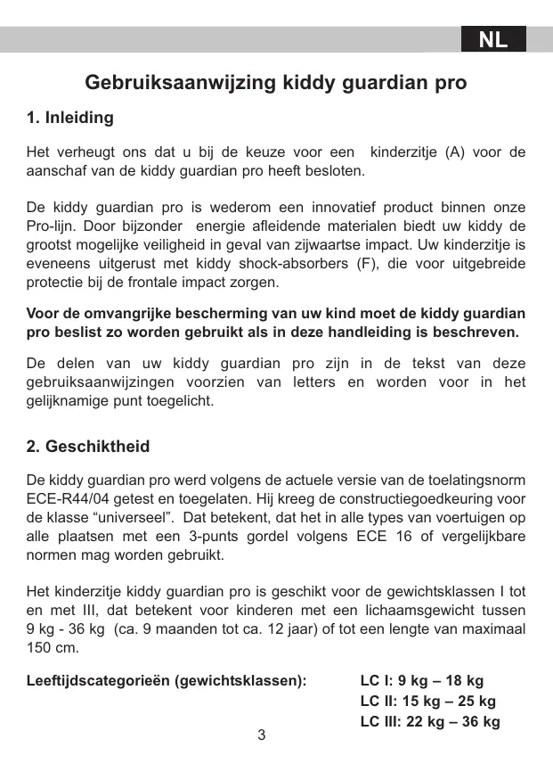 Afin que le siège enfant « kiddy guardian pro » assure une sécurité maximale à votre enfant, vous devez obligatoirement suivre les indications décrites dans la notice de l’utilisateur.