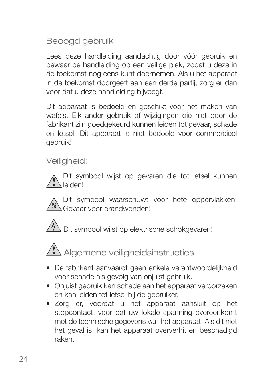 Beoogd gebruik Lees deze handleiding aandachtig door vóór gebruik en bewaar de handleiding op een veilige plek, zodat u deze in de toekomst nog eens kunt doornemen. Als u het apparaat in de toekomst doorgeeft aan een derde partij, zorg er dan voor dat u deze handleiding bijvoegt. Dit apparaat is bedoeld en geschikt voor het maken van wafels. Elk ander gebruik of wijzigingen die niet door de fabrikant zijn goedgekeurd kunnen leiden tot gevaar, schade en letsel. Dit apparaat is niet bedoeld voor commercieel gebruik! Veiligheid: Dit symbool wijst op gevaren die tot letsel kunnen leiden! Dit symbool waarschuwt voor hete oppervlakken. Gevaar voor brandwonden! Dit symbool wijst op elektrische schokgevaren! Algemene veiligheidsinstructies
