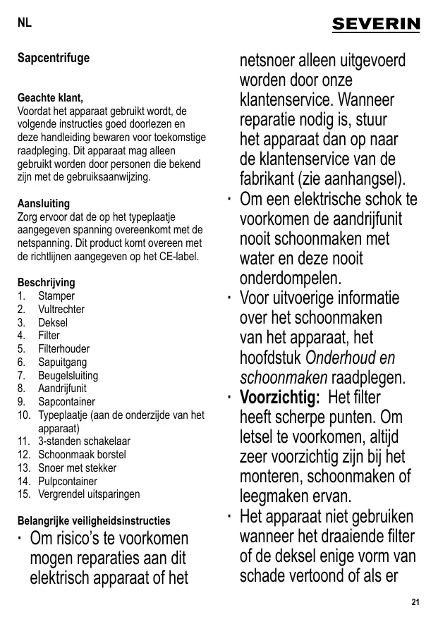 Breng dan de vergrendelclip omlaag en verwijder de stamper en deksel. ∙ Plaats uw linker hand onder de filterhouder en uw rechterhand onder de sapuitgang. Trek de filterhouder met een ‘wiebelende’ beweging omhoog (d.w.z. beurtelings links en rechts) totdat hij eraf komt. ∙ Verwijder de filterhouder en het filter. Sapcontainer Met de deksel op zijn plaats tijdens het uitschenken van het sap zal het schuim, wat tijdens de sap extractie is gevormd, in de container achterblijven. 2. Tubo de alimentación 3. Tapa 4. Filtro 5. Soporte del filtro 6. Salida de zumo 7. Clip de ajuste 8. Unidad de transmisión 9. Recipiente para el zumo 10. Placa de características (en la superficie inferior de la unidad) 11. Interruptor de 3 posiciones 12. Cepillo limpiador 13. Cable de alimentación con clavija 14. Recipiente para la pulpa 15. Huecos de ajuste Instrucciones importantes de seguridad