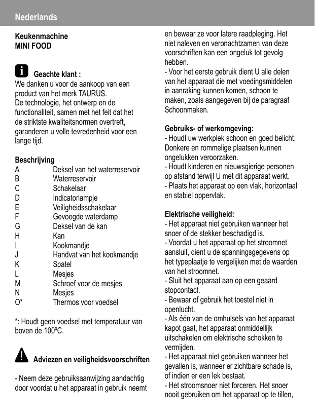 GEBRUIKSAANWIJZING ROBOT DE CUISINE A VAPEUR 925004 TAURUS