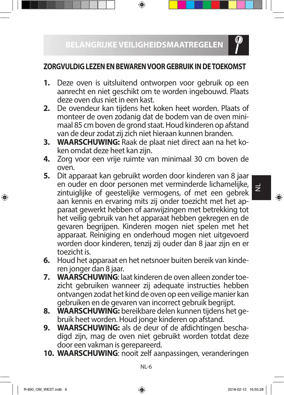 om ervoor de zorgen dat de oven naar wens werkt. NL-9 R-890_OM_WEST.indb 9 2018-02-12 16:55:28