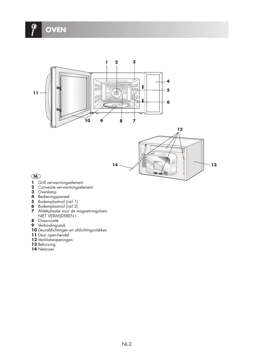 Grill verwarmingselement Convectie verwarmingselement Ovenlamp Bedieningspaneel Bodemplaatrail (rail 1) Bodemplaatrail (rail 2) Afdekplaatje voor de magnetrongolven. NIET VERWIJDEREN ! 8 Ovenruimte 9 Verbindingsstuk 10 Deurafdichtingen en afdichtingsvlakken 11 Deur open-hendel 12 Ventilatieopeningen 13 Behuizing 14 Netsnoer NL-2