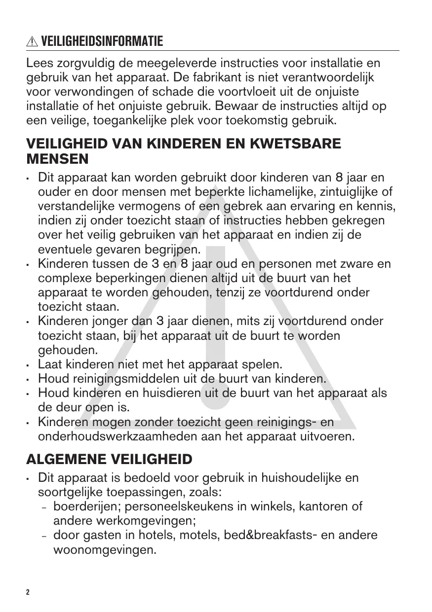 Dit apparaat kan worden gebruikt door kinderen van 8 jaar en ouder en door mensen met beperkte lichamelijke, zintuiglijke of verstandelijke vermogens of een gebrek aan ervaring en kennis, indien zij onder toezicht staan of instructies hebben gekregen over het veilig gebruiken van het apparaat en indien zij de eventuele gevaren begrijpen. Kinderen tussen de 3 en 8 jaar oud en personen met zware en complexe beperkingen dienen altijd uit de buurt van het apparaat te worden gehouden, tenzij ze voortdurend onder toezicht staan. Kinderen jonger dan 3 jaar dienen, mits zij voortdurend onder toezicht staan, bij het apparaat uit de buurt te worden gehouden. Laat kinderen niet met het apparaat spelen. Houd reinigingsmiddelen uit de buurt van kinderen. Houd kinderen en huisdieren uit de buurt van het apparaat als de deur open is. Kinderen mogen zonder toezicht geen reinigings- en onderhoudswerkzaamheden aan het apparaat uitvoeren.