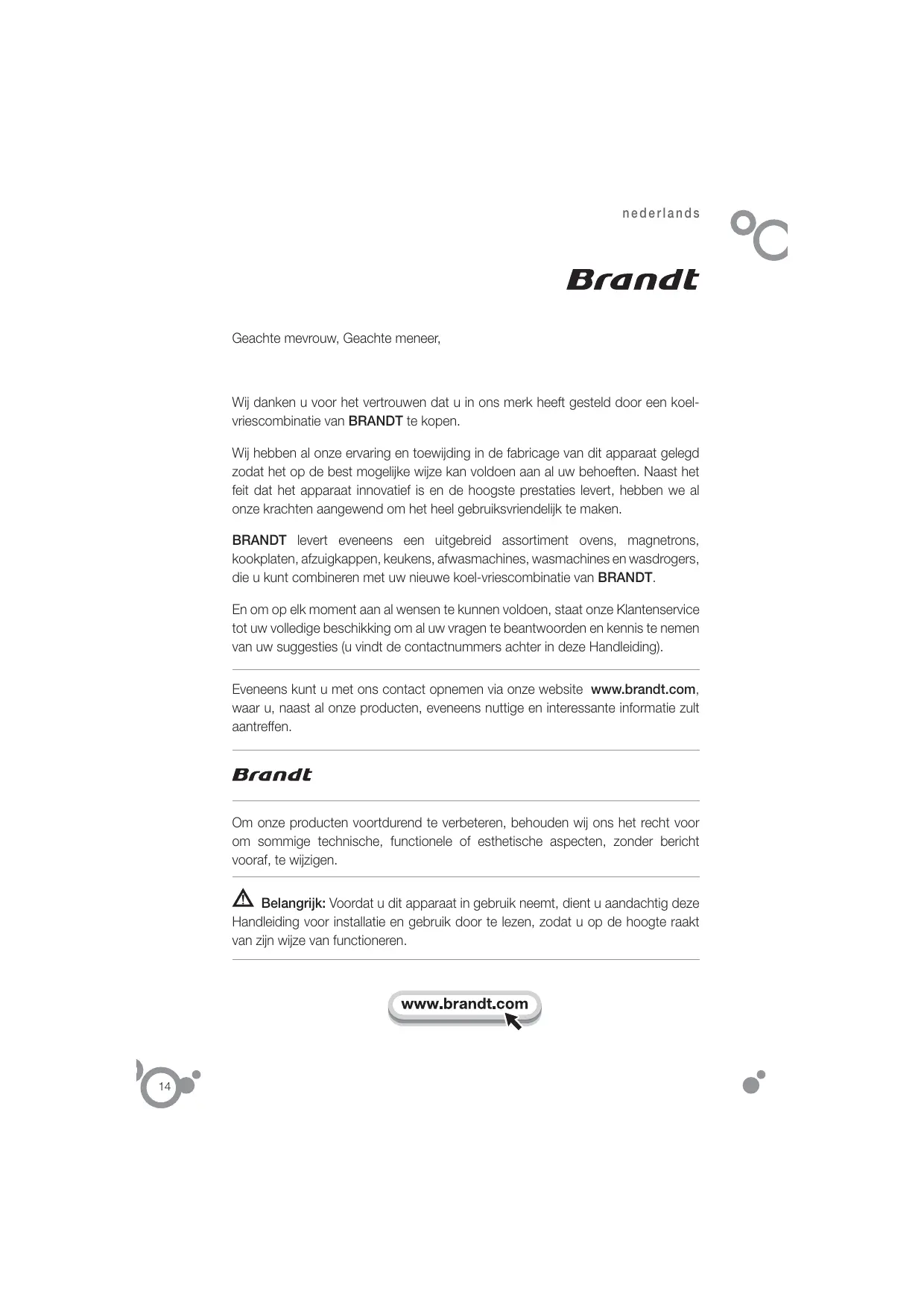 nederlands Geachte mevrouw, Geachte meneer, Wij danken u voor het vertrouwen dat u in ons merk heeft gesteld door een koelvriescombinatie van BRANDT te kopen. Wij hebben al onze ervaring en toewijding in de fabricage van dit apparaat gelegd zodat het op de best mogelijke wijze kan voldoen aan al uw behoeften. Naast het feit dat het apparaat innovatief is en de hoogste prestaties levert, hebben we al onze krachten aangewend om het heel gebruiksvriendelijk te maken. BRANDT levert eveneens een uitgebreid assortiment ovens, magnetrons, kookplaten, afzuigkappen, keukens, afwasmachines, wasmachines en wasdrogers, die u kunt combineren met uw nieuwe koel-vriescombinatie van BRANDT. En om op elk moment aan al wensen te kunnen voldoen, staat onze Klantenservice tot uw volledige beschikking om al uw vragen te beantwoorden en kennis te nemen van uw suggesties (u vindt de contactnummers achter in deze Handleiding). Eveneens kunt u met ons contact opnemen via onze website www.brandt.com, waar u, naast al onze producten, eveneens nuttige en interessante informatie zult aantreffen. Om onze producten voortdurend te verbeteren, behouden wij ons het recht voor om sommige technische, functionele of esthetische aspecten, zonder bericht vooraf, te wijzigen. Belangrijk: Voordat u dit apparaat in gebruik neemt, dient u aandachtig deze Handleiding voor installatie en gebruik door te lezen, zodat u op de hoogte raakt van zijn wijze van functioneren.