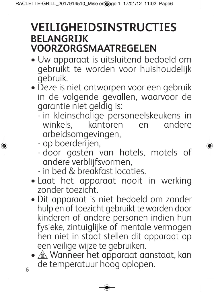 VEILIGHEIDSINSTRUCTIES BELANGRIJK VOORZORGSMAATREGELEN • Uw apparaat is uitsluitend bedoeld om gebruikt te worden voor huishoudelijk gebruik. • Deze is niet ontworpen voor een gebruik in de volgende gevallen, waarvoor de garantie niet geldig is: - in kleinschalige personeelskeukens in winkels, kantoren en andere arbeidsomgevingen, - op boerderijen, - door gasten van hotels, motels of andere verblijfsvormen, - in bed & breakfast locaties. • Laat het apparaat nooit in werking zonder toezicht. • Dit apparaat is niet bedoeld om zonder hulp en of toezicht gebruikt te worden door kinderen of andere personen indien hun fysieke, zintuiglijke of mentale vermogen hen niet in staat stellen dit apparaat op een veilige wijze te gebruiken. • Wanneer het apparaat aanstaat, kan de temperatuur hoog oplopen. 6