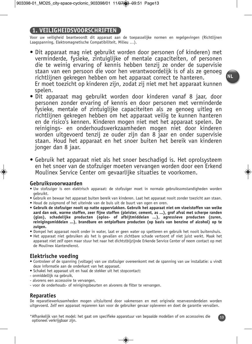 • Dit apparaat mag niet gebruikt worden door personen (of kinderen) met verminderde, fysieke, zintuiglijke of mentale capaciteiten, of personen die te weinig ervaring of kennis hebben tenzij ze onder de supervisie staan van een persoon die voor hen verantwoordelijk is of als ze genoeg NL richtlijnen gekregen hebben om het apparaat correct te hanteren. Er moet toezicht op kinderen zijn, zodat zij niet met het apparaat kunnen spelen. • Dit apparaat mag gebruikt worden door kinderen vanaf 8 jaar, door personen zonder ervaring of kennis en door personen met verminderde fysieke, mentale of zintuiglijke capaciteiten als ze genoeg uitleg en richtlijnen gekregen hebben om het apparaat veilig te kunnen hanteren en de risico's kennen. Kinderen mogen niet met het apparaat spelen. De reinigings- en onderhoudswerkzaamheden mogen niet door kinderen worden uitgevoerd tenzij ze ouder zijn dan 8 jaar en onder supervisie staan. Houd het apparaat en het snoer buiten het bereik van kinderen jonger dan 8 jaar. • Gebruik het apparaat niet als het snoer beschadigd is. Het oprolsysteem en het snoer van de stofzuiger moeten vervangen worden door een Erkend Moulinex Service Center om gevaarlijke situaties te voorkomen. Gebruiksvoorwaarden • Uw stofzuiger is een elektrisch apparaat: de stofzuiger moet in normale gebruiksomstandigheden worden gebruikt. • Gebruik en bewaar het apparaat buiten bereik van kinderen. Laat het apparaat nooit zonder toezicht aan staan. • Houd de zuigmond of het uiteinde van de buis uit de buurt van ogen en oren. • Gebruik de stofzuiger nooit op natte oppervlakken. Gebruik het apparaat niet om vloeistoffen van welke aard dan ook, warme stoffen, zeer fijne stoffen (pleister, cement, as ...), grof afval met scherpe randen (glas), schadelijke producten (oplos- of afbijtmiddelen ...), agressieve producten (zuren, reinigingsmiddelen ...), brandbare en ontplofbare producten (op basis van benzine of alcohol) op te zuigen. • Dompel het apparaat nooit onder in water, laat er geen water op spetteren en gebruik het nooit buitenshuis. • Het apparaat niet gebruiken als het is gevallen en zichtbare schade vertoont of niet juist werkt. Maak het apparaat niet zelf open maar stuur het naar het dichtstbijzijnde Erkende Service Center of neem contact op met de Moulinex klantendienst.