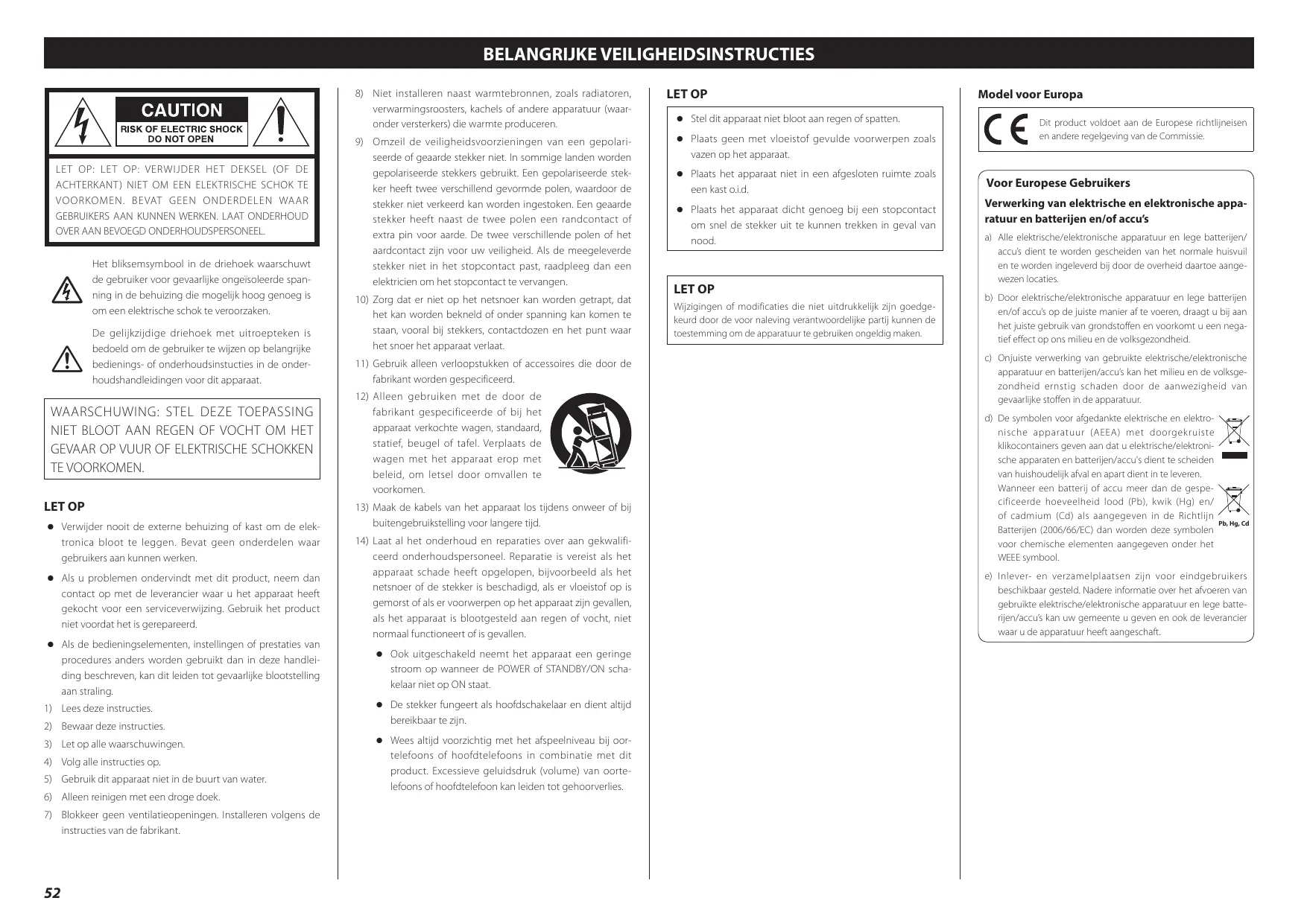 LET OP: LET OP: VERWIJDER HET DEKSEL (OF DE ACHTERKANT ) NIET OM EEN ELEKTRISCHE SCHOK TE VOORKOMEN. BEVAT GEEN ONDERDELEN WAAR GEBRUIKERS AAN KUNNEN WERKEN. LAAT ONDERHOUD OVER AAN BEVOEGD ONDERHOUDSPERSONEEL.