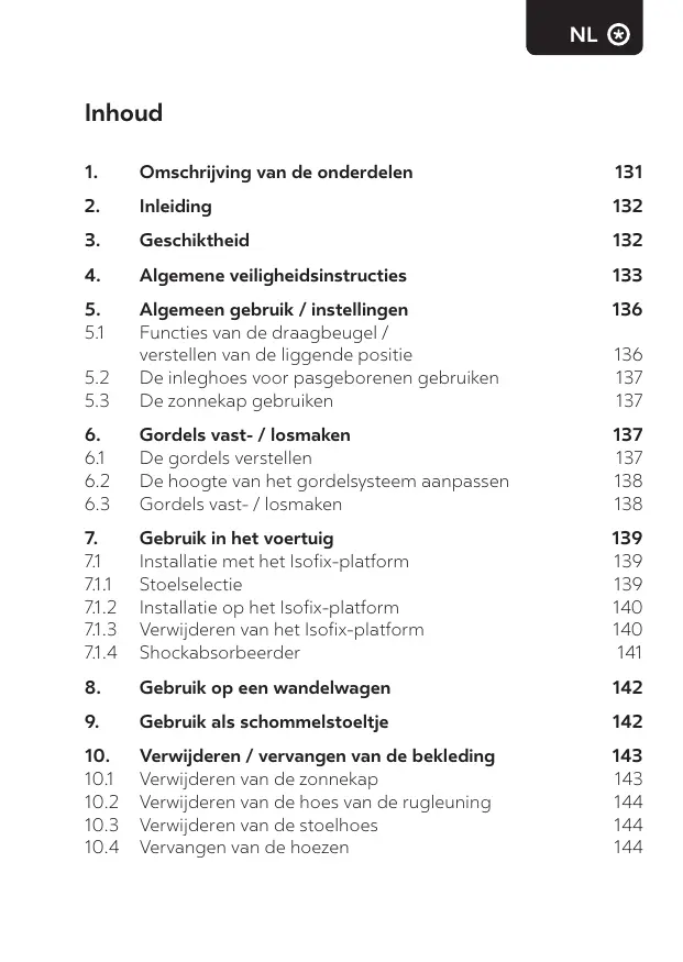 4. Het is gevaarlijk om het babystoeltje in liggende positie op een hoger oppervlak te zetten, zoals een tafel. 5. Gebruik altijd het veiligheidssysteem. 6. Gebruik het babystoeltje niet als onderdelen kapot zijn of ontbreken. 7. Gebruik alleen accessoires of reserveonderdelen die zijn goedgekeurd door de fabrikant. 8. Het babystoeltje is geen vervanging van een ledikant of bed. Als uw kind moet slapen, moet het in een geschikte ledikant of bed gelegd worden.