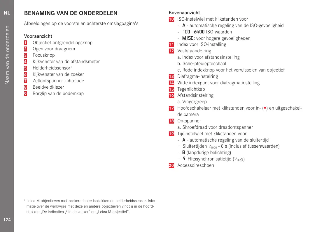 Bovenaanzicht 10 ISO-instelwiel met klikstanden voor – A - automatische regeling van de ISO-gevoeligheid – 100 - 6400 ISO-waarden – M ISO: voor hogere gevoeligheden 11 Index voor ISO-instelling 12 Vaststaande ring a. Index voor afstandsinstelling b. Scherptediepteschaal c. Rode indexknop voor het verwisselen van objectief 13 Diafragma-instelring 14 Witte indexpunt voor diafragma-instelling 15 Tegenlichtkap 16 Afstandsinstelring a. Vingergreep 17 Hoofdschakelaar met klikstanden voor in- () en uitgeschakelde camera 18 Ontspanner a. Shroefdraad voor draadontspanner 19 Tijdinstelwiel met klikstanden voor – A - automatische regeling van de sluitertijd – Sluitertijden 1⁄ 4000 - 8 s (inclusief tussenwaarden) – B (langdurige belichting) – Flitssynchronisatietijd (1⁄180s) 20 Accessoireschoen