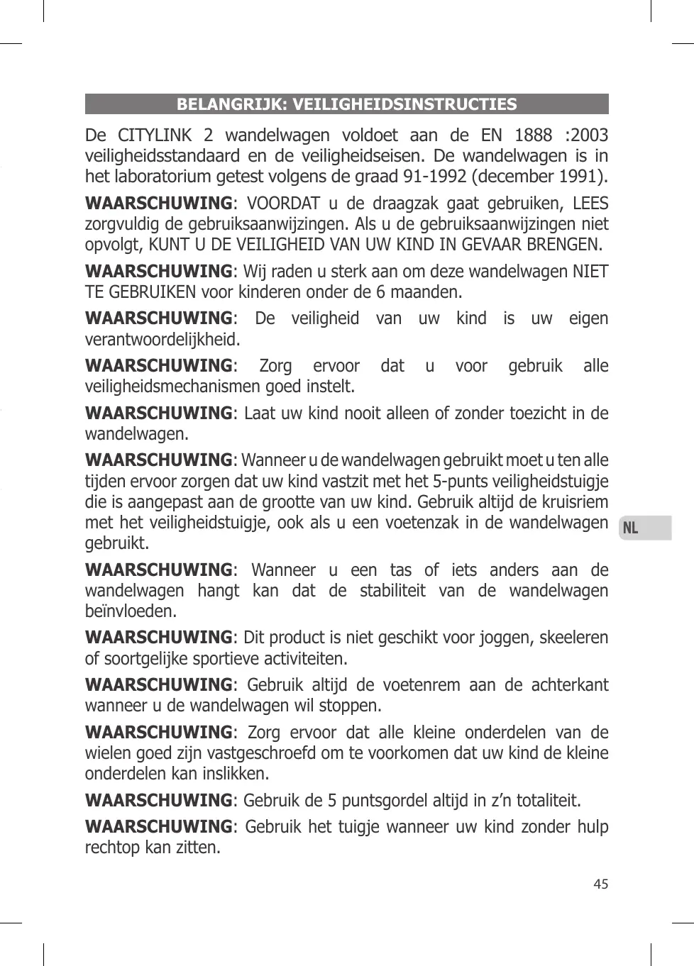 AVERTISSEMENT: Vous êtes responsable de la sécurité de votre enfant. FR AVERTISSEMENT: S’assurer que tous les dispositifs de verrouillage sont correctement enclenchés avant utilisation. AVERTISSEMENT: Il peut être dangereux de laisser votre enfant sans surveillance. AVERTISSEMENT: En toutes circonstances, attachez l’enfant avec le harnais de sécurité à 5 points ajusté à sa taille lorsque vous utilisez la poussette. Toujours utiliser la sangle de l’entrejambe avec le harnais de sécurité, même si vous utilisez une chancelière. AVERTISSEMENT: Le fait d’accrocher au poussoir une charge influe sur la stabilité de la poussette / du landau. AVERTISSEMENT: Ne pas utiliser ce produit en faisant du jogging ou des promenades en rollers. AVERTISSEMENT: Utilisez toujours le frein arrière au pied pour immobiliser la poussette. AVERTISSEMENT: Vous devez veiller à ce que les molettes et les bouchons des valves soient fermement vissés sur les roues pour éviter tout risque dû à la présence de petits éléments susceptibles d’être ingérés. AVERTISSEMENT: Ne jamais utiliser l’entrejambe sans la ceinture de maintien. AVERTISSEMENT: Utilisez un harnais dès que l’enfant peut tenir assis tout seul. 27