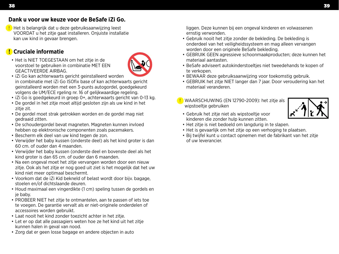 Dank u voor uw keuze voor de BeSafe iZi Go. !! Het is belangrijk dat u deze gebruiksaanwijzing leest VOORDAT u het zitje gaat installeren. Onjuiste installatie kan uw kind in gevaar brengen.