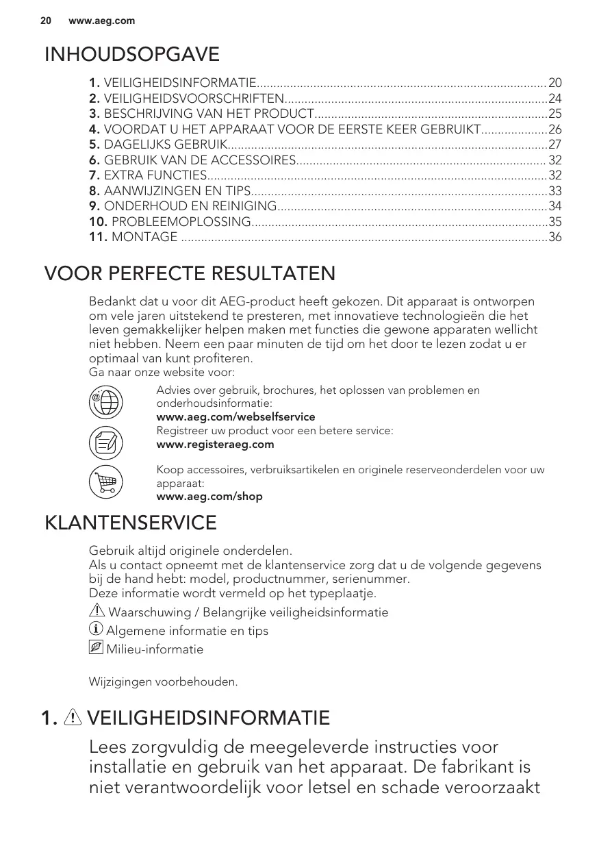 Bedankt dat u voor dit AEG-product heeft gekozen. Dit apparaat is ontworpen om vele jaren uitstekend te presteren, met innovatieve technologieën die het leven gemakkelijker helpen maken met functies die gewone apparaten wellicht niet hebben. Neem een paar minuten de tijd om het door te lezen zodat u er optimaal van kunt profiteren. Ga naar onze website voor: Advies over gebruik, brochures, het oplossen van problemen en onderhoudsinformatie: www.aeg.com/webselfservice Registreer uw product voor een betere service: www.registeraeg.com Koop accessoires, verbruiksartikelen en originele reserveonderdelen voor uw apparaat: www.aeg.com/shop KLANTENSERVICE Gebruik altijd originele onderdelen. Als u contact opneemt met de klantenservice zorg dat u de volgende gegevens bij de hand hebt: model, productnummer, serienummer. Deze informatie wordt vermeld op het typeplaatje. Waarschuwing / Belangrijke veiligheidsinformatie Algemene informatie en tips Milieu-informatie Wijzigingen voorbehouden.