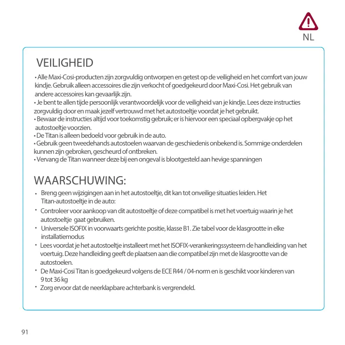 • Pour l’utilisation du système d’attache ISOFIX lisez IMPÉRATIVEMENT le manuel d’utilisation du véhicule, avant d’installer votre siège pour enfant. Il vous indiquera les places compatibles avec la classe de taille du siège pour enfant. • Titan de Maxi cosi a été approuvé selon les normes ECE R44 / 04 et convient aux enfants de 9 à 36 kg • Assurez-vous que le siège arrière rabattable est verrouillé. • L’utilisateur doit toujours veiller à ce que les bagages et autres objets susceptibles de causer des blessures à l’occupant du siège en cas de choc soient solidement arrimés.