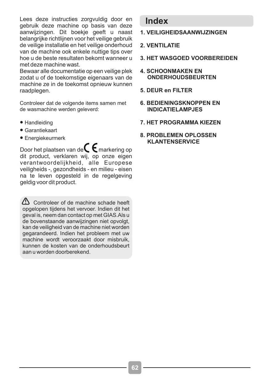 KLANTENSERVICE Door het plaatsen van de markering op dit product, verklaren wij, op onze eigen verantwoordelijkheid, alle Europese veiligheids -, gezondheids - en milieu - eisen na te leven opgesteld in de regelgeving geldig voor dit product. Controleer of de machine schade heeft opgelopen tijdens het vervoer. Indien dit het geval is, neem dan contact op met GIAS.Als u de bovenstaande aanwijzingen niet opvolgt, kan de veiligheid van de machine niet worden gegarandeerd. Indien het probleem met uw machine wordt veroorzaakt door misbruik, kunnen de kosten van de onderhoudsbeurt aan u worden doorberekend.