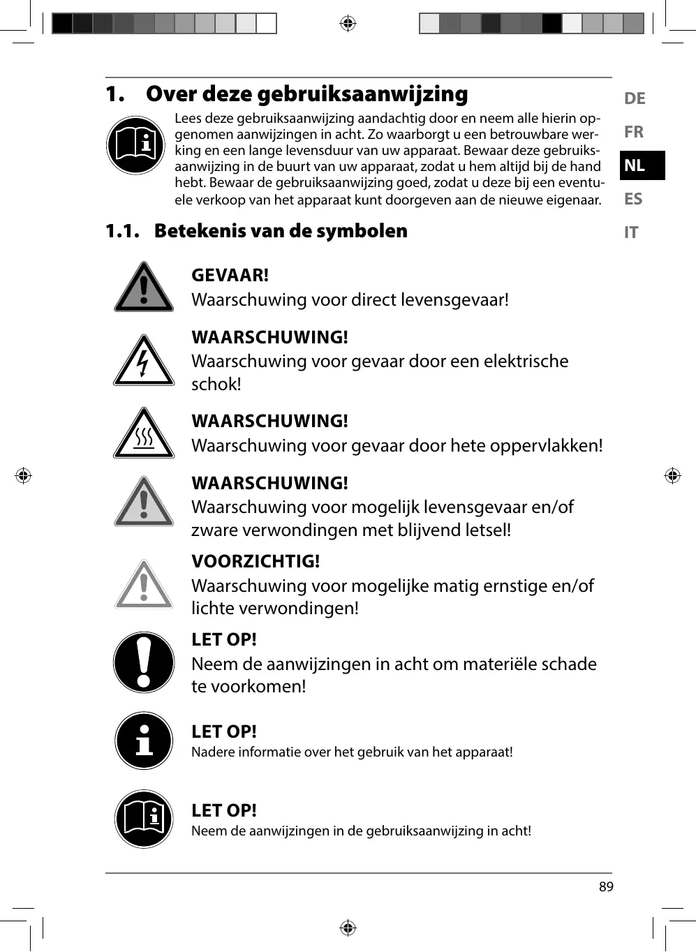 GEVAAR! Waarschuwing voor direct levensgevaar! WAARSCHUWING! Waarschuwing voor gevaar door een elektrische schok! WAARSCHUWING! Waarschuwing voor gevaar door hete oppervlakken! WAARSCHUWING! Waarschuwing voor mogelijk levensgevaar en/of zware verwondingen met blijvend letsel! VOORZICHTIG! Waarschuwing voor mogelijke matig ernstige en/of lichte verwondingen! LET OP! Neem de aanwijzingen in acht om materiële schade te voorkomen! LET OP! Nadere informatie over het gebruik van het apparaat! LET OP! Neem de aanwijzingen in de gebruiksaanwijzing in acht!