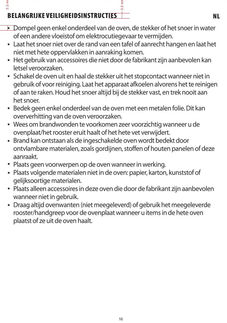 Dompel geen enkel onderdeel van de oven, de stekker of het snoer in water of een andere vloeistof om elektrocutiegevaar te vermijden. Laat het snoer niet over de rand van een tafel of aanrecht hangen en laat het niet met hete oppervlakken in aanraking komen. Het gebruik van accessoires die niet door de fabrikant zijn aanbevolen kan letsel veroorzaken. Schakel de oven uit en haal de stekker uit het stopcontact wanneer niet in gebruik of voor reiniging. Laat het apparaat afkoelen alvorens het te reinigen of aan te raken. Houd het snoer altijd bij de stekker vast, en trek nooit aan het snoer. Bedek geen enkel onderdeel van de oven met een metalen folie. Dit kan oververhitting van de oven veroorzaken. Wees om brandwonden te voorkomen zeer voorzichtig wanneer u de ovenplaat/het rooster eruit haalt of het hete vet verwijdert. Brand kan ontstaan als de ingeschakelde oven wordt bedekt door ontvlambare materialen, zoals gordijnen, stoffen of houten panelen of deze aanraakt. Plaats geen voorwerpen op de oven wanneer in werking. Plaats volgende materialen niet in de oven: papier, karton, kunststof of gelijksoortige materialen. Plaats alleen accessoires in deze oven die door de fabrikant zijn aanbevolen wanneer niet in gebruik. Draag altijd ovenwanten (niet meegeleverd) of gebruik het meegeleverde rooster/handgreep voor de ovenplaat wanneer u items in de hete oven plaatst of ze uit de oven haalt.