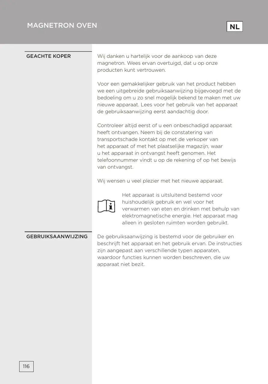 Wij danken u hartelijk voor de aankoop van deze magnetron. Wees ervan overtuigd, dat u op onze producten kunt vertrouwen. Voor een gemakkelijker gebruik van het product hebben we een uitgebreide gebruiksaanwijzing bijgevoegd met de bedoeling om u zo snel mogelijk bekend te maken met uw nieuwe apparaat. Lees voor het gebruik van het apparaat de gebruiksaanwijzing eerst aandachtig door. Controleer altijd eerst of u een onbeschadigd apparaat heeft ontvangen. Neem bij de constatering van transportschade kontakt op met de verkoper van het apparaat of met het plaatselijke magazijn, waar u het apparaat in ontvangst heeft genomen. Het telefoonnummer vindt u op de rekening of op het bewijs van ontvangst. Wij wensen u veel plezier met het nieuwe apparaat. Het apparaat is uitsluitend bestemd voor huishoudelijk gebruik en wel voor het verwarmen van eten en drinken met behulp van elektromagnetische energie. Het apparaat mag alleen in gesloten ruimten worden gebruikt. GEBRUIKSAANWIJZING