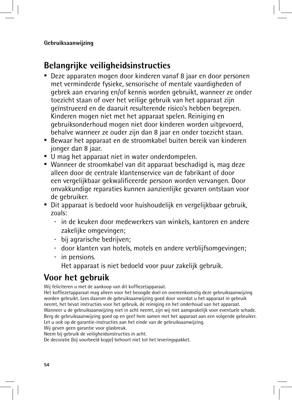 (6) en (8) gaan branden. ▪▪ Druk daarna op de knop (6) om de instelling voor de waterhardheid te wijzigen, de aan/uit-knop (5) knippert blauw. ▪▪ Via de startknoppen (6), (7), (6) en (8) gaan branden. ▪▪ Druk daarna op de knop (8) om de instelling voor de hoeveelheid koffie per kopje te wijzigen, de aan/uit-knop (5) knippert wit. ▪▪ Via de startknoppen (6), (8) of (9) kunt u de hoeveelheid koffie per kopje wijzigen. ▪▪ Het ontkalkingsprogramma eindigt automatisch na ca. 35 minuten en het apparaat schakelt automatisch uit. Aanwijzing: Tijdens het ontkalken wordt het apparaat meerdere malen in- en uitgeschakeld. ▪▪ Leeg het waterreservoir (3) en de glazen aromakan (4). Het filterinzet (2), waterreservoir (3) en de glazen aromakan (4) grondig met helder leidingwater omspoelen. ▪▪ Belangrijk: Vervolgens nogmaals spoelen (zie de paragraaf ‘Spoelen’) met helder leidingwater.