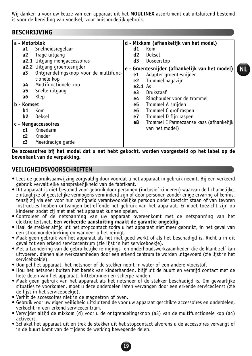 2.3 - DISMANTLING THE ACCESSORY • Führen Sie niemals Utensilien (Löffel, Küchenspachtel ...) durch die Öffnung des Deckels (d2), in die Rührschüssel • Este aparato no está diseñado para que lo utilicen personas (incluyendo niños) con alguna discapacidad física, sensorial o mental, o con falta de experiencia y conocimientos, a no ser que sean supervisadas, o que la persona responsable de su seguridad les haya proporcionado instrucciones sobre el funcionamiento del aparato. No permita que los niños jueguen con el aparato. • Compruebe que la tensión de alimentación del aparato coincide con la tensión de su red eléctrica. Cualquier conexión incorrecta anulará la garantía. • Desconecte siempre el aparato cuando deje de utilizarlo, en caso de corte de corriente o cuando proceda a su limpieza. • No utilice el aparato si no funciona correctamente o si se ha estropeado. En este caso, diríjase a un centro de servicio oficial (consulte la lista en el folleto de servicio). • Cualquier tarea de mantenimiento, salvo las tareas de limpieza y conservación habituales realizadas por el cliente, debe llevarse a cabo en un centro de servicio oficial (consulte la lista en el folleto de servicio). • No sumerja el aparato, el cable de alimentación o el enchufe en agua u otro líquido. • No deje el cable de alimentación colgando al alcance de los niños, cerca o en contacto con las partes calientes del aparato, cerca de una fuente de calor o en un ángulo vivo. • No utilice el aparato si el cable de alimentación o el enchufe están dañados. Para evitar cualquier riesgo, estas piezas deben sustituirse siempre en un centro de servicio oficial (consulte la lista en el folleto de servicio). • No meta los accesorios en el microondas. • Por su seguridad, utilice únicamente accesorios y piezas de recambio adecuadas para el aparato, suministradas por un centro de servicio oficial. • Retire siempre el vaso mezclador (d) antes de pulsar el botón de desbloqueo (a3) del cabezal multifunción (a4). • Apague el aparato y desconéctelo de la red eléctrica cuando vaya a cambiar los accesorios o a tocar alguna de las piezas que son móviles durante su funcionamiento. • Deberá tener cuidado al manipular las cuchillas afiladas de los accesorios (d y e), al vaciar los recipientes o al limpiar el aparato, ya que pueden provocar cortes graves. • No toque los accesorios mezcladores mientras el aparato esté en funcionamiento. • Ponga en marcha el aparato girando el botón regulador (a1) hasta la velocidad deseada en función de la receta. • Puede añadir los alimentos por el orificio de la tapa (b2) durante la preparación. • Para detener el aparato, devuelva el botón (a1) a la posición "0". Consejos: - Amasar Para un mejor control de la mezcla y una mejor homogeneización de la preparación, utilice la posición "Pulse". Puede añadir alimentos durante la preparación, retirando el tapón dosificador (d3) de la tapa (d2). • Para detener el aparato, devuelva el botón (a1) a la posición "0".