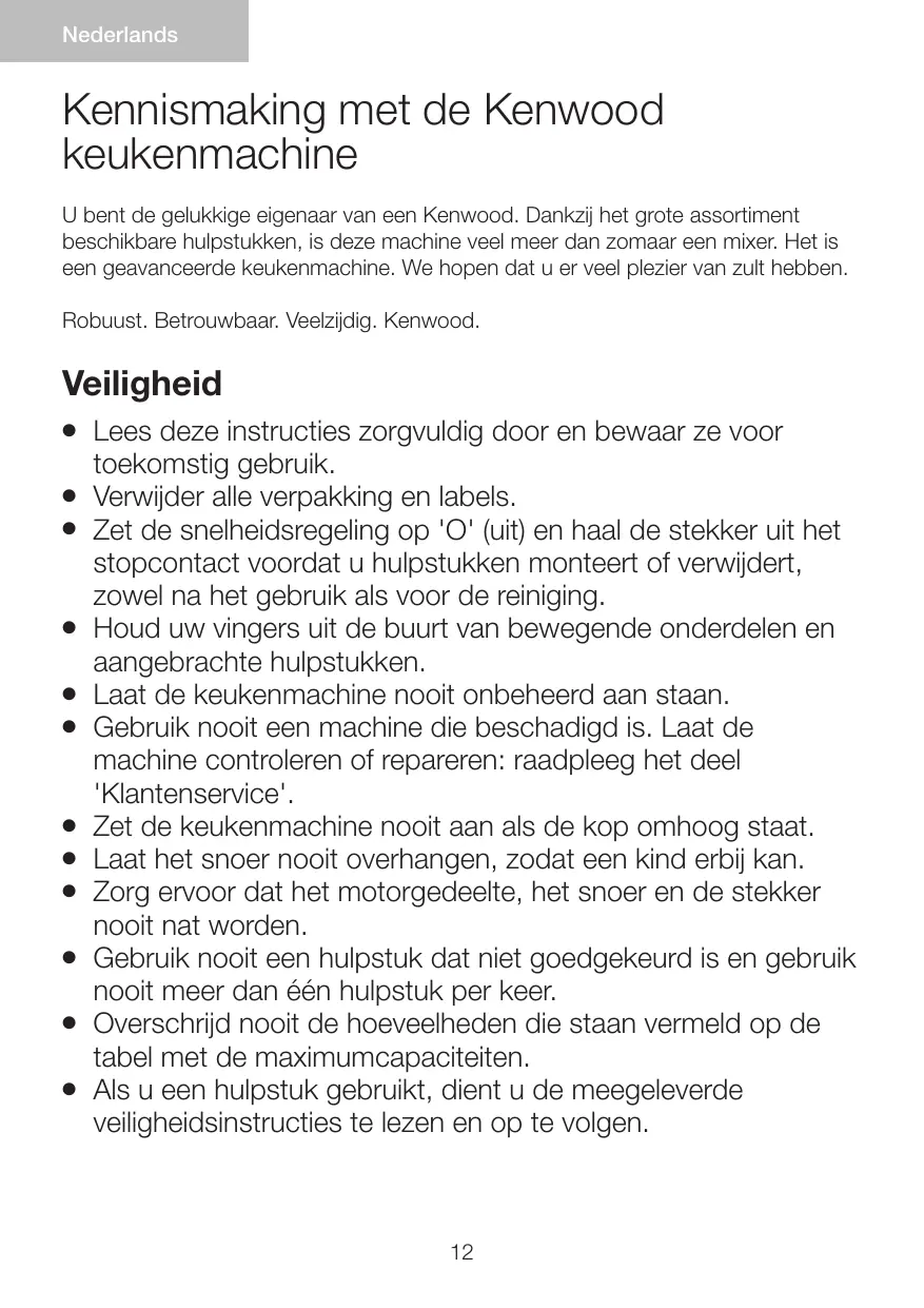 Lees deze instructies zorgvuldig door en bewaar ze voor toekomstig gebruik. Verwijder alle verpakking en labels. Zet de snelheidsregeling op 'O' (uit) en haal de stekker uit het stopcontact voordat u hulpstukken monteert of verwijdert, zowel na het gebruik als voor de reiniging. Houd uw vingers uit de buurt van bewegende onderdelen en aangebrachte hulpstukken. Laat de keukenmachine nooit onbeheerd aan staan. Gebruik nooit een machine die beschadigd is. Laat de machine controleren of repareren: raadpleeg het deel 'Klantenservice'. Zet de keukenmachine nooit aan als de kop omhoog staat. Laat het snoer nooit overhangen, zodat een kind erbij kan. Zorg ervoor dat het motorgedeelte, het snoer en de stekker nooit nat worden. Gebruik nooit een hulpstuk dat niet goedgekeurd is en gebruik nooit meer dan één hulpstuk per keer. Overschrijd nooit de hoeveelheden die staan vermeld op de tabel met de maximumcapaciteiten. Als u een hulpstuk gebruikt, dient u de meegeleverde veiligheidsinstructies te lezen en op te volgen.