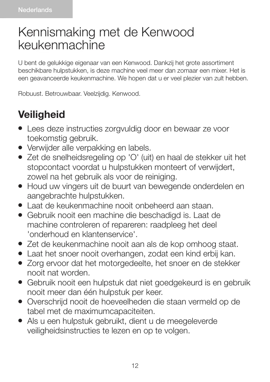 Les enfants doivent être sous surveillance pour veiller à ce qu'ils ne jouent pas avec l'appareil. Ne bougez pas la tête du robot, et ne la soulevez pas lorsqu'un accessoire est installé car cela pourrait rendre le robot pâtissier multifonction instable. Ne faites pas fonctionner votre appareil près du bord d'un plan de travail. Les appareils peuvent être utilisée par des personnes dont les capacités physiques, sensorielles ou mentales sont diminuées, ou qui ne disposent pas des connaissances ou de l’expérience nécessaires, si elles ont été formées et encadrées pour l’utilisation des appareils, et si elles ont conscience des risques encourus. Toute mauvaise utilisation de votre appareil peut être source de blessures. Cet appareil ne doit pas être utilisé par des enfants. Veuillez garder l'appareil et le cordon hors de portée des enfants. N’employez l’appareil qu’à des fins domestiques. Kenwood décline toute responsabilité dans les cas où l’appareil est utilisé incorrectement ou que les présentes instructions ne sont pas respectées. • Cet appareil est conforme au règlement 1935/2004 de la CE sur les matériaux et les articles destinés au contact alimentaire.