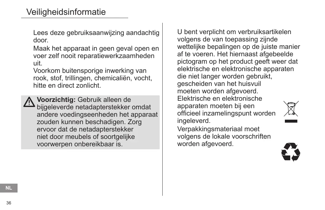 Veiligheidsinformatie Lees deze gebruiksaanwijzing aandachtig U bent verplicht om verbruiksartikelen volgens de van toepassing zijnde door. wettelijke bepalingen op de juiste manier Maak het apparaat in geen geval open en af te voeren. Het hiernaast afgebeelde voer zelf nooit reparatiewerkzaamheden pictogram op het product geeft weer dat uit. elektrische en elektronische apparaten Voorkom buitensporige inwerking van die niet langer worden gebruikt, rook, stof, trillingen, chemicaliën, vocht, gescheiden van het huisvuil hitte en direct zonlicht. moeten worden afgevoerd. Elektrische en elektronische Voorzichtig: Gebruik alleen de apparaten moeten bij een bijgeleverde netadapterstekker omdat officieel inzamelingspunt worden andere voedingseenheden het apparaat ingeleverd. zouden kunnen beschadigen. Zorg Verpakkingsmateriaal moet ervoor dat de netadapterstekker volgens de lokale voorschriften niet door meubels of soortgelijke worden afgevoerd. voorwerpen onbereikbaar is.