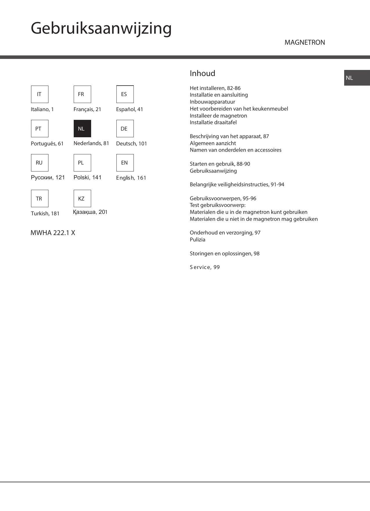 NL Het installeren, 82-86 Installatie en aansluiting Inbouwapparatuur Het voorbereiden van het keukenmeubel Installeer de magnetron Installatie draaitafel Beschrijving van het apparaat, 87 Algemeen aanzicht Namen van onderdelen en accessoires Starten en gebruik, 88-90 Gebruiksaanwijzing Belangrijke veiligheidsinstructies, 91-94 Gebruiksvoorwerpen, 95-96 Test gebruiksvoorwerp: Materialen die u in de magnetron kunt gebruiken Materialen die u niet in de magnetron mag gebruiken Onderhoud en verzorging, 97 Pulizia Storingen en oplossingen, 98 S ervic e, 9 9
