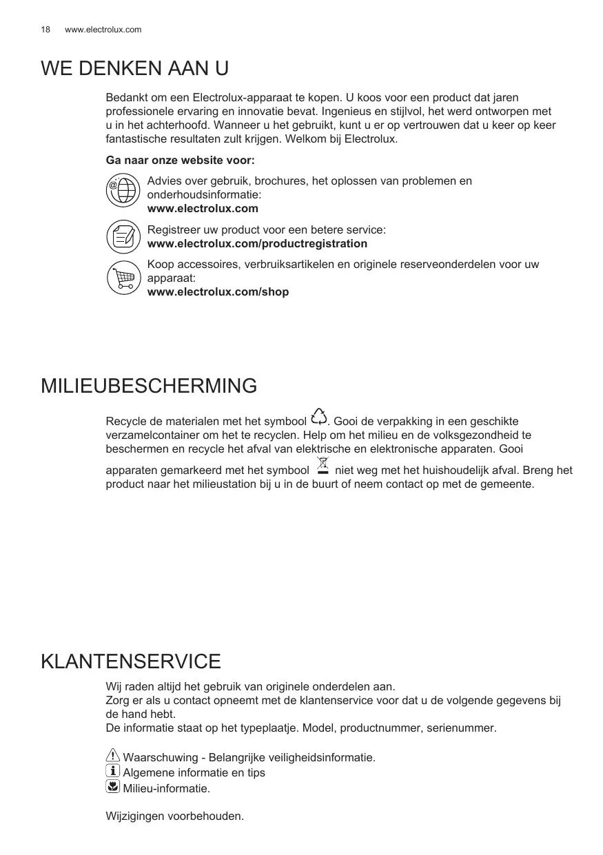 Bedankt om een Electrolux-apparaat te kopen. U koos voor een product dat jaren professionele ervaring en innovatie bevat. Ingenieus en stijlvol, het werd ontworpen met u in het achterhoofd. Wanneer u het gebruikt, kunt u er op vertrouwen dat u keer op keer fantastische resultaten zult krijgen. Welkom bij Electrolux. Ga naar onze website voor: Advies over gebruik, brochures, het oplossen van problemen en onderhoudsinformatie: www.electrolux.com Registreer uw product voor een betere service: www.electrolux.com/productregistration Koop accessoires, verbruiksartikelen en originele reserveonderdelen voor uw apparaat: www.electrolux.com/shop MILIEUBESCHERMING Recycle de materialen met het symbool . Gooi de verpakking in een geschikte verzamelcontainer om het te recyclen. Help om het milieu en de volksgezondheid te beschermen en recycle het afval van elektrische en elektronische apparaten. Gooi apparaten gemarkeerd met het symbool niet weg met het huishoudelijk afval. Breng het product naar het milieustation bij u in de buurt of neem contact op met de gemeente. KLANTENSERVICE Wij raden altijd het gebruik van originele onderdelen aan. Zorg er als u contact opneemt met de klantenservice voor dat u de volgende gegevens bij de hand hebt. De informatie staat op het typeplaatje. Model, productnummer, serienummer. Waarschuwing - Belangrijke veiligheidsinformatie. Algemene informatie en tips Milieu-informatie. Wijzigingen voorbehouden. NEDERLANDS