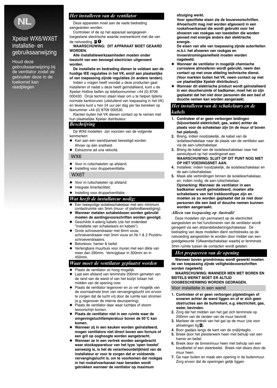 WORDEN. Alle installatiewerkzaamheden moeten onder toezicht van een bevoegd electricien uitgevoerd worden. De installatie en bedrading dienen te voldoen aan de huidige IEE regulaties in het VK, en/of aan plaatselijke of van toepassing zijnde regulaties (in andere landen). Indien u vragen heeft voordat u deze producten gaat installeren of nadat u deze heeft geïnstalleerd, kunt u de Xpelair Hotline bellen op telefoonnummer +44 (0) 8709 000430. Onze technici staan klaar om u te helpen tijdens normale kantooruren (uitsluitend van toepassing in het VK) en tevens kunt u hen 24 uur per dag per fax bereiken op faxnummer +44 (0) 8709 000530. Klanten buiten het VK dienen contact op te nemen met hun plaatselijke Xpelair distributeur. Beschrijving De WX6 modellen zijn voorzien van de volgende kenmerken: ◆ Kan aan een wand/paneel bevestigd worden Afvoer op één snelheid. ◆ Estrazione ad una velocità. WX6 ◆ Voor in-/uitschakelen op afstand. ◆ Instelling voor druppelventilatie. WX6T ◆ Voor in-/uitschakelen op afstand. ◆ Integrale timerfaciliteit. ◆ Instelling voor druppelventilatie. Wat heeft de installateur nodig: ◆ Een tweepolige isolatieschakelaar met een minimum contactruimte van 3mm (muur- of plafondbevestiging). ◆ Wanneer metalen schakeldozen worden gebruikt moeten de aardingsvoorschriften worden gevolgd. ◆ Geschikte 4-aderig kabels (zie het onderdeel "Installatie van schakelaars en kabels"). ◆ Grote schroevendraaier met 6mm vouw, schroevendraaier met 3mm vouw en Nr.1 & 2 Pozidrivschroevendraaiers. ◆ Betonboor, hamer & beitel. ◆ Verlengbare muurbuis voor muren met een dikte van meer dan 290mm. Verkrijgbaar in 300mm en in 450mm. Waar moet de ventilator geplaatst worden ◆ Plaats de ventilator zo hoog mogelijk. ◆ Laat een afstand van tenminste 200mm gemeten van de rand van de wand of van het kozijn totaan het midden van de opening over. ◆ Plaats de ventilator tegenover en zo ver mogelijk van de voornaamste bron van vervangingslucht om ervoor te zorgen dat de lucht vrij door de ruimte kan stromen (e.g. tegenover de interne deuropening). ◆ Plaats de ventilator daar waar luchtjes of stoom tevoorschijn komen. ◆ Plaats de ventilator niet in een ruimte waar de omgevingsluchttemperatuur boven de 50°C kan komen. ◆ Wanneer zij in een keuken worden geïnstalleerd, mogen ventilators niet direct boven een fornuis of een gril op ooghoogte worden aangebracht. ◆ Wanneer ze in een vertrek worden aangebracht waar stookapparatuur van het type 'open toestel' aanwezig is, is het de verantwoordelijkheid van de installateur er voor te zorgen dat er voldoende vervangingslucht is, om te voorkomen dat rookgas in het rookafvoerkanaal naar beneden wordt getrokken wanneer de ventilator op maximum afzuiging werkt. Voor specifieke eisen zie de bouwvoorschriften. Afvoerlucht mag niet worden afgevoerd in een rookafvoerkanaal die wordt gebruikt voor het afvoeren van rookgas van toestellen die worden gevoed met energie anders dan elektrische energie. De eisen van alle van toepassing zijnde autoriteiten m.b.t. het afvoeren van rookgas en invoerstromingssnelheid moeten worden nageleefd. ◆ Wanneer de ventilator in mogelijk chemische corrosieve atmosferen wordt gebruikt, neem dan contact op met onze afdeling technische dienst. (Voor markten buiten het VK, neem contact op met uw plaatselijke Xpelair distributeur). ◆ Wanneer dit elektrische product wordt geïnstalleerd in een doucheruimte of badkamer, moet het zo zijn geplaatst dat het niet door personen die een bad of douche nemen kan worden aangeraakt. Het installeren van de schakelaars en de kabels