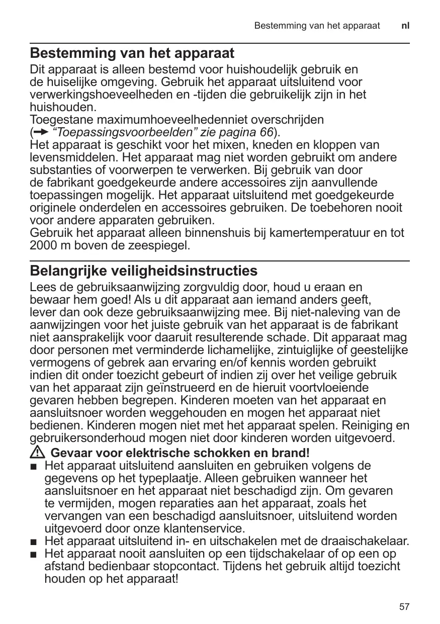 Bestemming van het apparaat Dit apparaat is alleen bestemd voor huishoudelijk gebruik en de huiselijke omgeving. Gebruik het apparaat uitsluitend voor verwerkingshoeveelheden en -tijden die gebruikelijk zijn in het huishouden. Toegestane maximumhoeveelhedenniet overschrijden (X “Toepassingsvoorbeelden” zie pagina 66). Het apparaat is geschikt voor het mixen, kneden en kloppen van levensmiddelen. Het apparaat mag niet worden gebruikt om andere substanties of voorwerpen te verwerken. Bij gebruik van door de fabrikant goedgekeurde andere accessoires zijn aanvullende toepassingen mogelijk. Het apparaat uitsluitend met goedgekeurde originele onderdelen en accessoires gebruiken. De toebehoren nooit voor andere apparaten gebruiken. Gebruik het apparaat alleen binnenshuis bij kamertemperatuur en tot 2000 m boven de zeespiegel. Belangrijke veiligheidsinstructies Lees de gebruiksaanwijzing zorgvuldig door, houd u eraan en bewaar hem goed! Als u dit apparaat aan iemand anders geeft, lever dan ook deze gebruiksaanwijzing mee. Bij niet-naleving van de aanwijzingen voor het juiste gebruik van het apparaat is de fabrikant niet aansprakelijk voor daaruit resulterende schade. Dit apparaat mag door personen met verminderde lichamelijke, zintuiglijke of geestelijke vermogens of gebrek aan ervaring en/of kennis worden gebruikt indien dit onder toezicht gebeurt of indien zij over het veilige gebruik van het apparaat zijn geïnstrueerd en de hieruit voortvloeiende gevaren hebben begrepen. Kinderen moeten van het apparaat en aansluitsnoer worden weggehouden en mogen het apparaat niet bedienen. Kinderen mogen niet met het apparaat spelen. Reiniging en gebruikersonderhoud mogen niet door kinderen worden uitgevoerd. WW Gevaar voor elektrische schokken en brand! ■■ Het apparaat uitsluitend aansluiten en gebruiken volgens de gegevens op het typeplaatje. Alleen gebruiken wanneer het aansluitsnoer en het apparaat niet beschadigd zijn. Om gevaren te vermijden, mogen reparaties aan het apparaat, zoals het vervangen van een beschadigd aansluitsnoer, uitsluitend worden uitgevoerd door onze klantenservice. ■■ Het apparaat uitsluitend in- en uitschakelen met de draaischakelaar. ■■ Het apparaat nooit aansluiten op een tijdschakelaar of op een op afstand bedienbaar stopcontact. Tijdens het gebruik altijd toezicht houden op het apparaat!