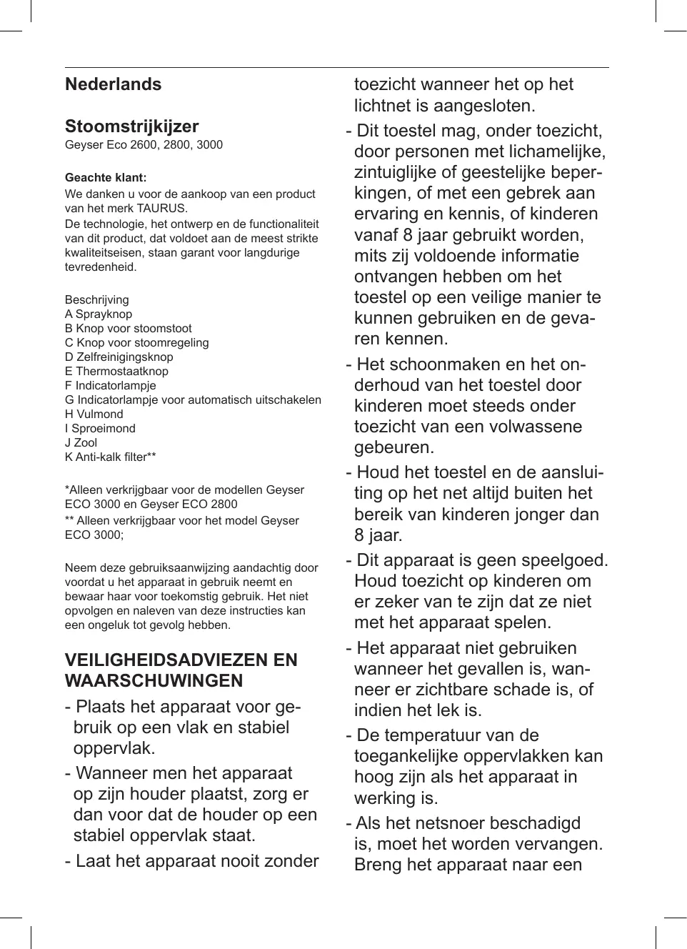 GEBRUIKSAANWIJZING GEYSER ECO 3000 TAURUS