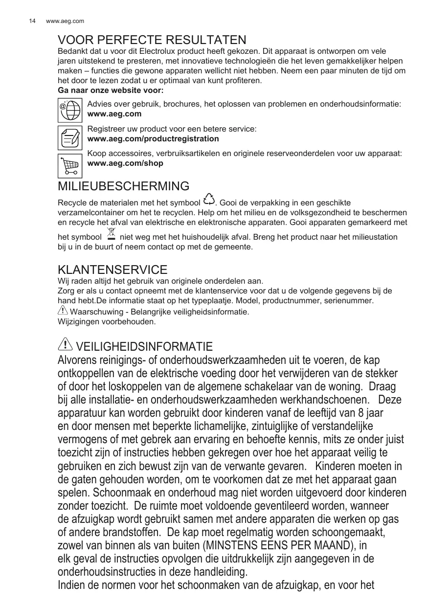 Bedankt dat u voor dit Electrolux product heeft gekozen. Dit apparaat is ontworpen om vele jaren uitstekend te presteren, met innovatieve technologieën die het leven gemakkelijker helpen maken – functies die gewone apparaten wellicht niet hebben. Neem een paar minuten de tijd om het door te lezen zodat u er optimaal van kunt profiteren. Ga naar onze website voor: Advies over gebruik, brochures, het oplossen van problemen en onderhoudsinformatie: www.aeg.com Registreer uw product voor een betere service: www.aeg.com/productregistration Koop accessoires, verbruiksartikelen en originele reserveonderdelen voor uw apparaat: www.aeg.com/shop MILIEUBESCHERMING Recycle de materialen met het symbool . Gooi de verpakking in een geschikte verzamelcontainer om het te recyclen. Help om het milieu en de volksgezondheid te beschermen en recycle het afval van elektrische en elektronische apparaten. Gooi apparaten gemarkeerd met het symbool niet weg met het huishoudelijk afval. Breng het product naar het milieustation bij u in de buurt of neem contact op met de gemeente. KLANTENSERVICE Wij raden altijd het gebruik van originele onderdelen aan. Zorg er als u contact opneemt met de klantenservice voor dat u de volgende gegevens bij de hand hebt.De informatie staat op het typeplaatje. Model, productnummer, serienummer. Waarschuwing - Belangrijke veiligheidsinformatie. Wijzigingen voorbehouden. VEILIGHEIDSINFORMATIE Alvorens reinigings- of onderhoudswerkzaamheden uit te voeren, de kap ontkoppellen van de elektrische voeding door het verwijderen van de stekker of door het loskoppelen van de algemene schakelaar van de woning. Draag bij alle installatie- en onderhoudswerkzaamheden werkhandschoenen. Deze apparatuur kan worden gebruikt door kinderen vanaf de leeftijd van 8 jaar en door mensen met beperkte lichamelijke, zintuiglijke of verstandelijke vermogens of met gebrek aan ervaring en behoefte kennis, mits ze onder juist toezicht zijn of instructies hebben gekregen over hoe het apparaat veilig te gebruiken en zich bewust zijn van de verwante gevaren. Kinderen moeten in de gaten gehouden worden, om te voorkomen dat ze met het apparaat gaan spelen. Schoonmaak en onderhoud mag niet worden uitgevoerd door kinderen zonder toezicht. De ruimte moet voldoende geventileerd worden, wanneer de afzuigkap wordt gebruikt samen met andere apparaten die werken op gas of andere brandstoffen. De kap moet regelmatig worden schoongemaakt, zowel van binnen als van buiten (MINSTENS EENS PER MAAND), in elk geval de instructies opvolgen die uitdrukkelijk zijn aangegeven in de onderhoudsinstructies in deze handleiding. Indien de normen voor het schoonmaken van de afzuigkap, en voor het NEDERLANDS