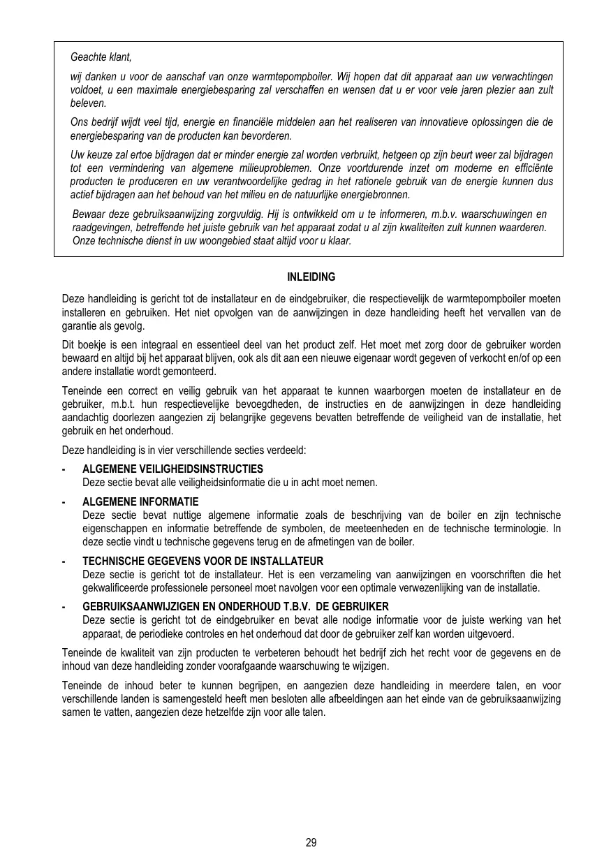 Geachte klant, wij danken u voor de aanschaf van onze warmtepompboiler. Wij hopen dat dit apparaat aan uw verwachtingen voldoet, u een maximale energiebesparing zal verschaffen en wensen dat u er voor vele jaren plezier aan zult beleven. Ons bedrijf wijdt veel tijd, energie en financiële middelen aan het realiseren van innovatieve oplossingen die de energiebesparing van de producten kan bevorderen. Uw keuze zal ertoe bijdragen dat er minder energie zal worden verbruikt, hetgeen op zijn beurt weer zal bijdragen tot een vermindering van algemene milieuproblemen. Onze voortdurende inzet om moderne en efficiënte producten te produceren en uw verantwoordelijke gedrag in het rationele gebruik van de energie kunnen dus actief bijdragen aan het behoud van het milieu en de natuurlijke energiebronnen. Bewaar deze gebruiksaanwijzing zorgvuldig. Hij is ontwikkeld om u te informeren, m.b.v. waarschuwingen en raadgevingen, betreffende het juiste gebruik van het apparaat zodat u al zijn kwaliteiten zult kunnen waarderen. Onze technische dienst in uw woongebied staat altijd voor u klaar. INLEIDING Deze handleiding is gericht tot de installateur en de eindgebruiker, die respectievelijk de warmtepompboiler moeten installeren en gebruiken. Het niet opvolgen van de aanwijzingen in deze handleiding heeft het vervallen van de garantie als gevolg. Dit boekje is een integraal en essentieel deel van het product zelf. Het moet met zorg door de gebruiker worden bewaard en altijd bij het apparaat blijven, ook als dit aan een nieuwe eigenaar wordt gegeven of verkocht en/of op een andere installatie wordt gemonteerd. Teneinde een correct en veilig gebruik van het apparaat te kunnen waarborgen moeten de installateur en de gebruiker, m.b.t. hun respectievelijke bevoegdheden, de instructies en de aanwijzingen in deze handleiding aandachtig doorlezen aangezien zij belangrijke gegevens bevatten betreffende de veiligheid van de installatie, het gebruik en het onderhoud. Deze handleiding is in vier verschillende secties verdeeld: