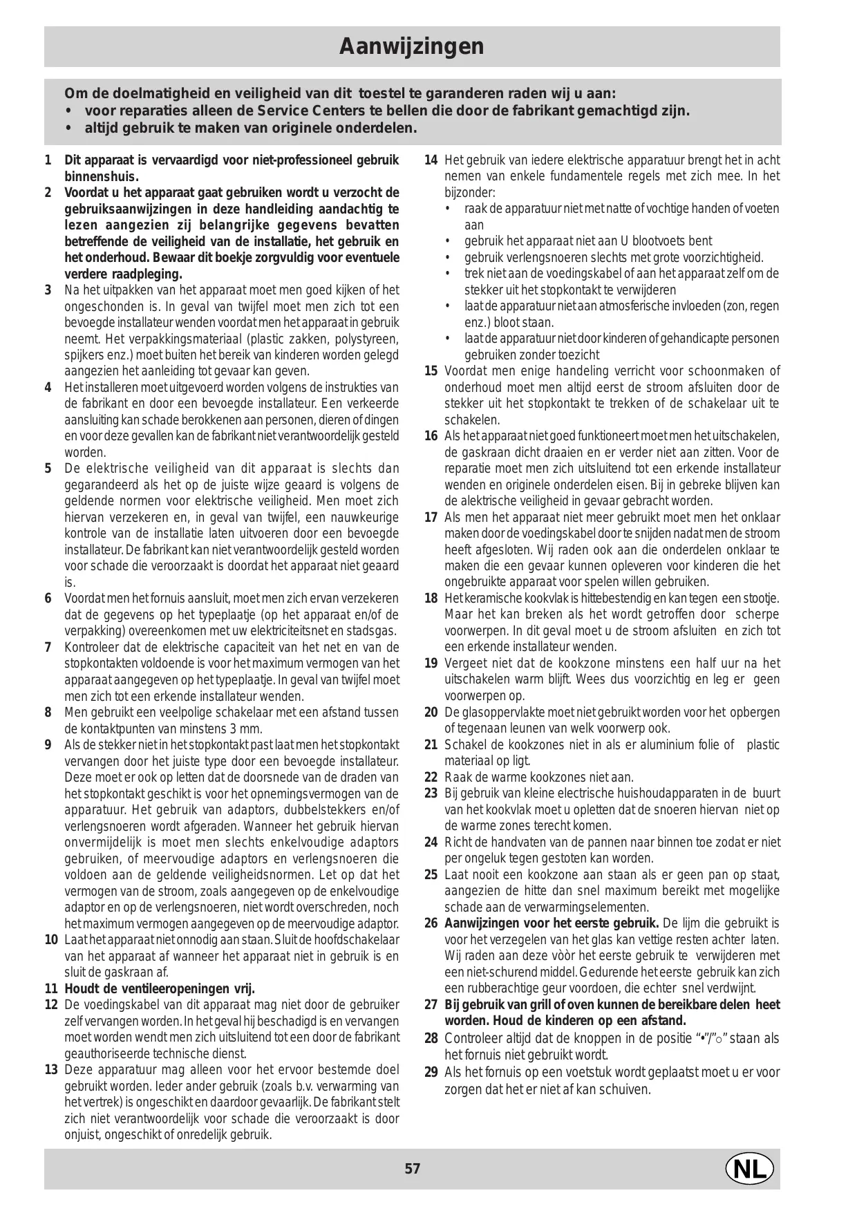 Het fornuis heeft een protectiegraad tegen oververhitting van het type X en het kan dus geïnstalleerd worden naast meubels die niet hoger zijn dan het kookvlak. De oven verenigt in één enkel apparaat de voordelen van de traditionele ovens met natuurlijke convectie: "statisch", met de voordelen van de moderne hetelucht-ovens: "Hetelucht" Dit is een veelzijdig apparaat waarmee u op eenvoudige en veilige wijze kunt kiezen tussen 5 verschillende manieren van koken. U kiest de verschillende functies door middel van de keuzeknop "L" en de thermostaatknop "M" op het bedieningspaneel. "Ontdooi" oven De pannen Voor de beste resultaten van uw kookvlak bestaan enkele fundamentele regels die u moet volgen bij het koken. • Op het keramische kookvlak kunnen alle mogelijke pannen gebruikt worden. Het is echter belangrijk dat de bodem perfect plat is; pannen met een dikke bodem verdelen de hitte beter.