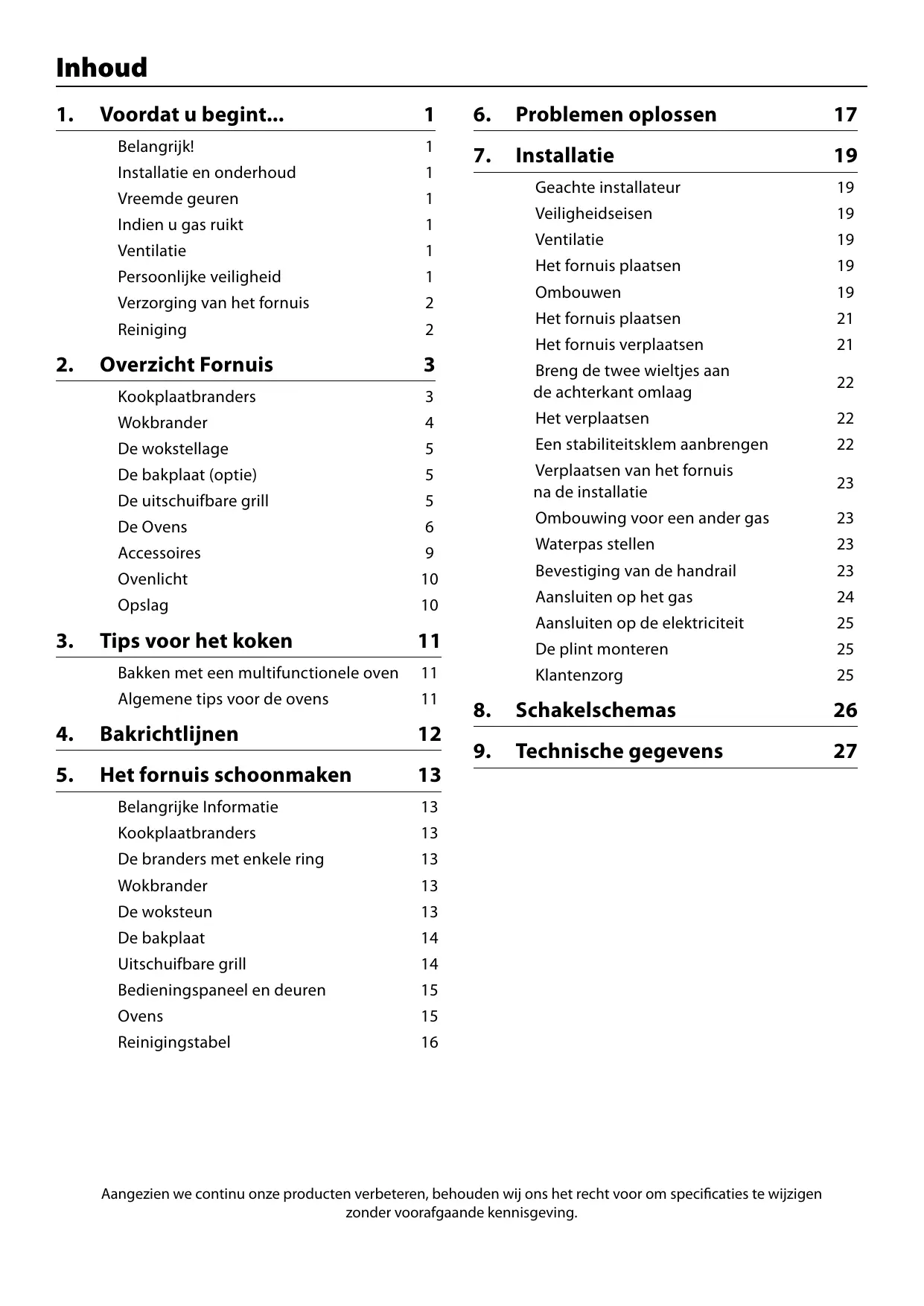 NIET de elektrische schakelaars aan of uit zetten NIET roken GEEN open vuur gebruiken WEL het gas uitzetten bij de meter of cilinder WEL deuren en ramen open zetten om het gas te laten ontsnappen WEL mensen uit de buurt van het betrokken gebied houden Bel het gasbedrijf. Ventilatie Bij het gebruik van een fornuis komt er warmte en vocht vrij in de ruimte waarin het fornuis is geïnstalleerd. Zorg ervoor dat de keuken goed geventileerd is: houd bestaande ventilatiegaten open of installeer een aangedreven afzuigkap die de dampen naar buiten toe afvoert. Indien u gedurende lange tijd meerdere branders van het fornuis tegelijk gebruikt, dient u een raam open te zetten of een ventilator aan te zetten. Dit fornuis is een apparaat van Klasse 1. Installatie en onderhoud Het fornuis moet worden geïnstalleerd conform de relevante instructies in dit boekje, de relevante voorschriften alsmede de vereisten van de plaatselijke gas- en energiebedrijven. Persoonlijke veiligheid Zorg ervoor dat de gasvoeding en de stroomvoeding aangesloten en ingeschakeld zijn (het fornuis gebruikt stroom). Het fornuis mag uitsluitend worden gerepareerd door een bevoegd onderhoudstechnicus en er mogen uitsluitend goedgekeurde reserveonderdelen worden gebruikt. Voordat er met schoonmaken of onderhoudswerk wordt begonnen, dient u het fornuis altijd eerst te laten afkoelen en de stroom af te sluiten, tenzij deze handleiding iets anders aangeeft.