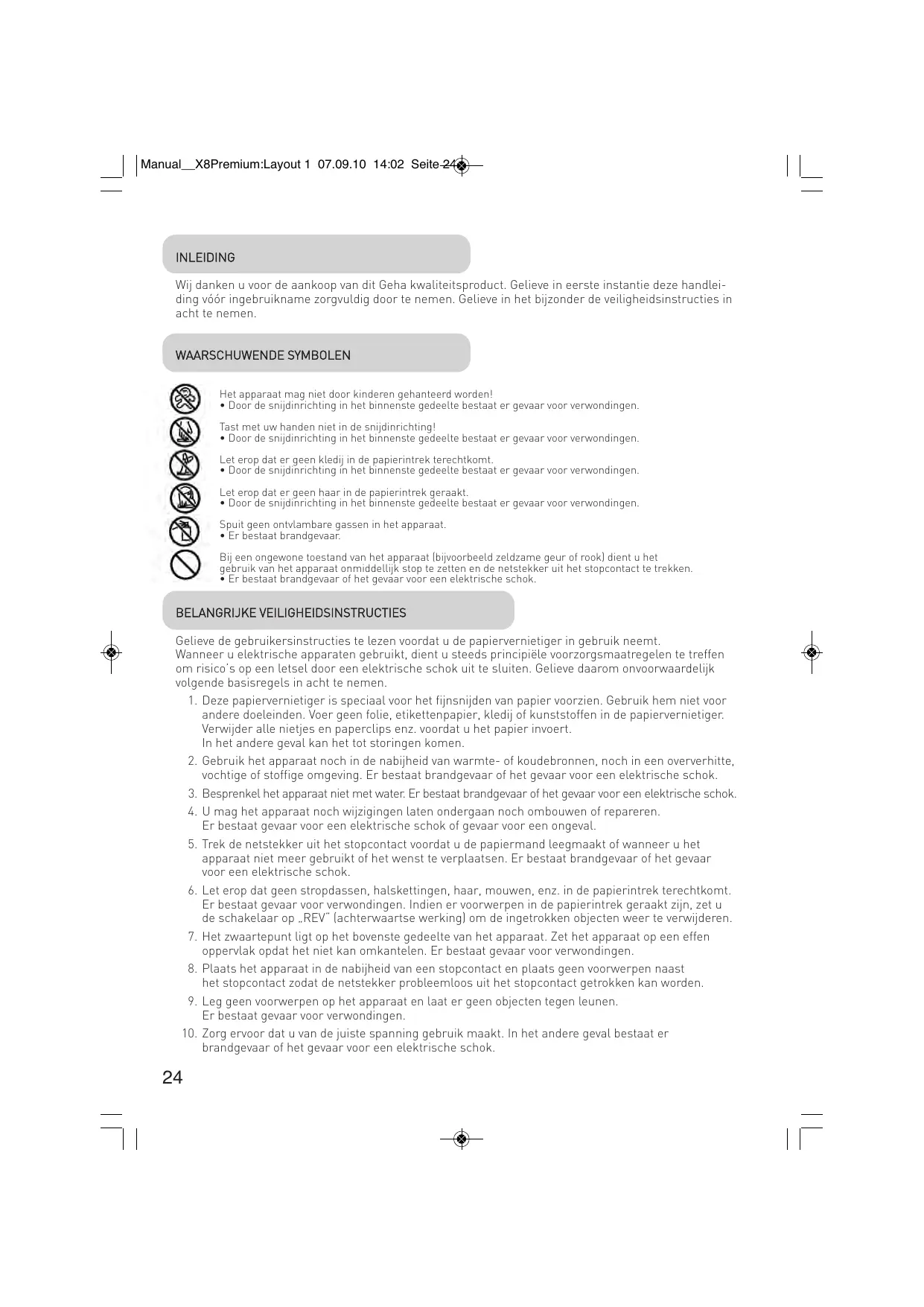 Manual__X8Premium:Layout 1 07.09.10 14:02 Seite 24 INLEIDING Wij danken u voor de aankoop van dit Geha kwaliteitsproduct. Gelieve in eerste instantie deze handleiding vóór ingebruikname zorgvuldig door te nemen. Gelieve in het bijzonder de veiligheidsinstructies in acht te nemen. WAARSCHUWENDE SYMBOLEN Het apparaat mag niet door kinderen gehanteerd worden!