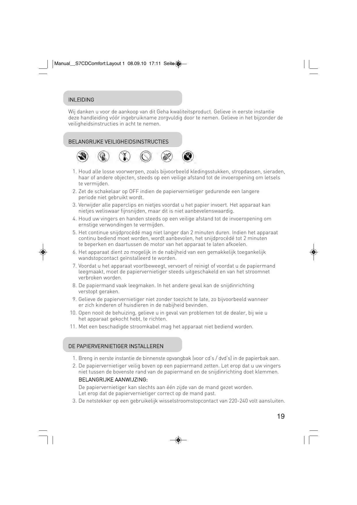 Manual__S7CDComfort:Layout 1 08.09.10 17:11 Seite 19 INLEIDING Wij danken u voor de aankoop van dit Geha kwaliteitsproduct. Gelieve in eerste instantie deze handleiding vóór ingebruikname zorgvuldig door te nemen. Gelieve in het bijzonder de veiligheidsinstructies in acht te nemen. BELANGRIJKE VEILIGHEIDSINSTRUCTIES