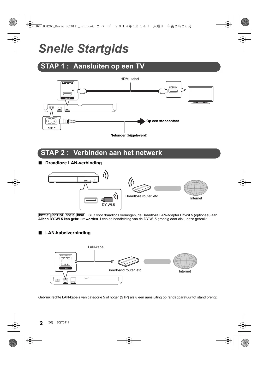 Snelle Startgids STAP 1 : Aansluiten op een TV HDMI-kabel HDMI IN Op een stopcontact Netsnoer (bijgeleverd) STAP 2 : Verbinden aan het netwerk ∫ Draadloze LAN-verbinding Draadloze router, etc. Internet DY-WL5 [BDT161] [BDT160] [BD813] [BD81] : Sluit voor draadloos vermogen, de Draadloze LAN-adapter DY-WL5 (optioneel) aan. Alleen DY-WL5 kan gebruikt worden. Lees de handleiding van de DY-WL5 grondig door als u deze gebruikt. ∫ LAN-kabelverbinding LAN-kabel Breedband router, etc. Internet Gebruik rechte LAN-kabels van categorie 5 of hoger (STP) als u een aansluiting op randapparatuur tot stand brengt.