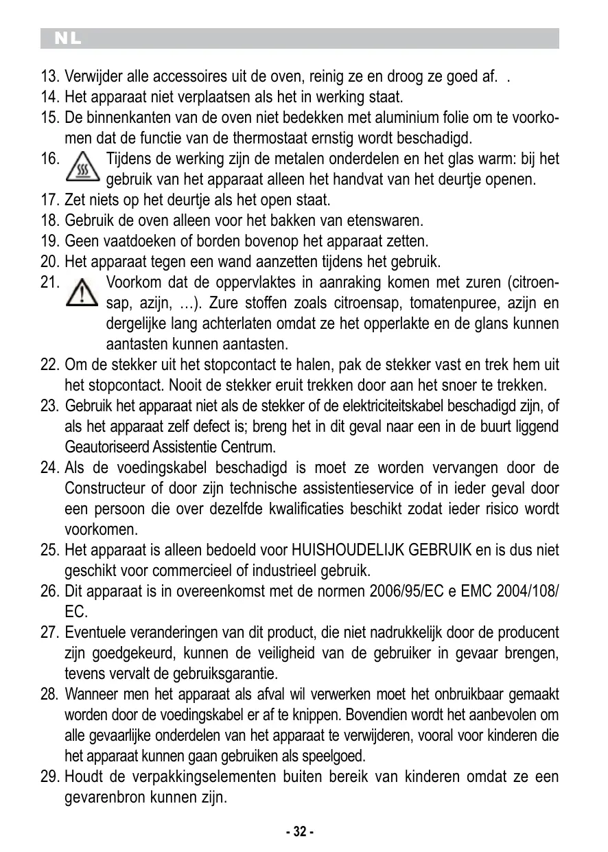 NL 13. Verwijder alle accessoires uit de oven, reinig ze en droog ze goed af. . 14. Het apparaat niet verplaatsen als het in werking staat. 15. De binnenkanten van de oven niet bedekken met aluminium folie om te voorkomen dat de functie van de thermostaat ernstig wordt beschadigd. 16. Tijdens de werking zijn de metalen onderdelen en het glas warm: bij het gebruik van het apparaat alleen het handvat van het deurtje openen. 17. Zet niets op het deurtje als het open staat. 18. Gebruik de oven alleen voor het bakken van etenswaren. 19. Geen vaatdoeken of borden bovenop het apparaat zetten. 20. Het apparaat tegen een wand aanzetten tijdens het gebruik. 21. Voorkom dat de oppervlaktes in aanraking komen met zuren (citroensap, azijn, …). Zure stoffen zoals citroensap, tomatenpuree, azijn en dergelijke lang achterlaten omdat ze het opperlakte en de glans kunnen aantasten kunnen aantasten. 22. Om de stekker uit het stopcontact te halen, pak de stekker vast en trek hem uit het stopcontact. Nooit de stekker eruit trekken door aan het snoer te trekken. 23. Gebruik het apparaat niet als de stekker of de elektriciteitskabel beschadigd zijn, of als het apparaat zelf defect is; breng het in dit geval naar een in de buurt liggend Geautoriseerd Assistentie Centrum. 24. Als de voedingskabel beschadigd is moet ze worden vervangen door de Constructeur of door zijn technische assistentieservice of in ieder geval door een persoon die over dezelfde kwalificaties beschikt zodat ieder risico wordt voorkomen. 25. Het apparaat is alleen bedoeld voor HUISHOUDELIJK GEBRUIK en is dus niet geschikt voor commercieel of industrieel gebruik. 26. Dit apparaat is in overeenkomst met de normen 2006/95/EC e EMC 2004/108/ EC. 27. Eventuele veranderingen van dit product, die niet nadrukkelijk door de producent zijn goedgekeurd, kunnen de veiligheid van de gebruiker in gevaar brengen, tevens vervalt de gebruiksgarantie. 28. Wanneer men het apparaat als afval wil verwerken moet het onbruikbaar gemaakt worden door de voedingskabel er af te knippen. Bovendien wordt het aanbevolen om alle gevaarlijke onderdelen van het apparaat te verwijderen, vooral voor kinderen die het apparaat kunnen gaan gebruiken als speelgoed. 29. Houdt de verpakkingselementen buiten bereik van kinderen omdat ze een gevarenbron kunnen zijn. - 32 -