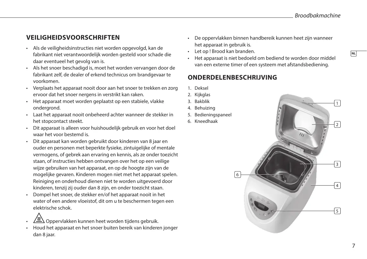 De oppervlakken binnen handbereik kunnen heet zijn wanneer het apparaat in gebruik is. Let op ! Brood kan branden. Het apparaat is niet bedoeld om bediend te worden door middel van een externe timer of een systeem met afstandsbediening.