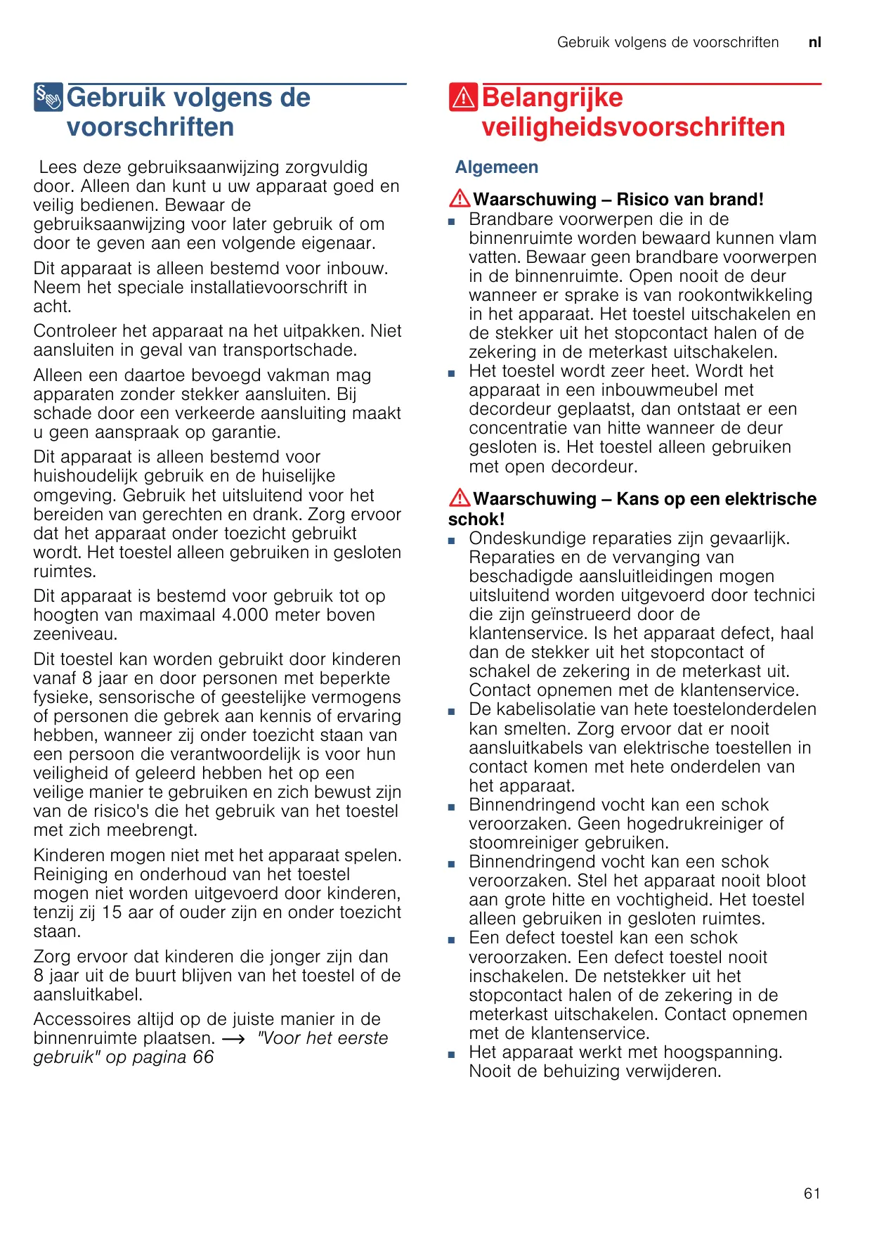Belangrijke veiligheidsvoorschriften : Waarschuwing – Risico van brand! Het apparaat wordt zeer heet. Houd u aan de opgaven voor de minimale afstand boven het apparaat. ~ Blz. 64 – Het apparaat niet inbouwen achter een decor- of meubeldeur. – Het apparaat mag niet in een inbouwmeubel worden geplaatst. Dan bestaat het risico van oververhitting. Risico van verbranding! Toebehoren of vormen worden zeer heet. Neem hete toebehoren en vormen altijd met behulp van een pannenlap uit de binnenruimte. Risico van verbranding! Alcoholdampen kunnen in de binnenruimte vlam vatten. Nooit gerechten klaarmaken die een hoog percentage alcohol bevatten. Alleen kleine hoeveelheden drank met een hoog alcoholpercentage gebruiken. De deur van het toestel voorzichtig openen.